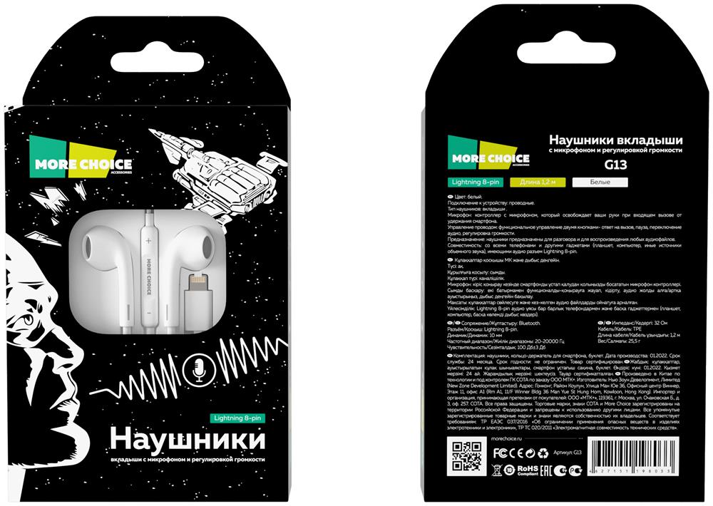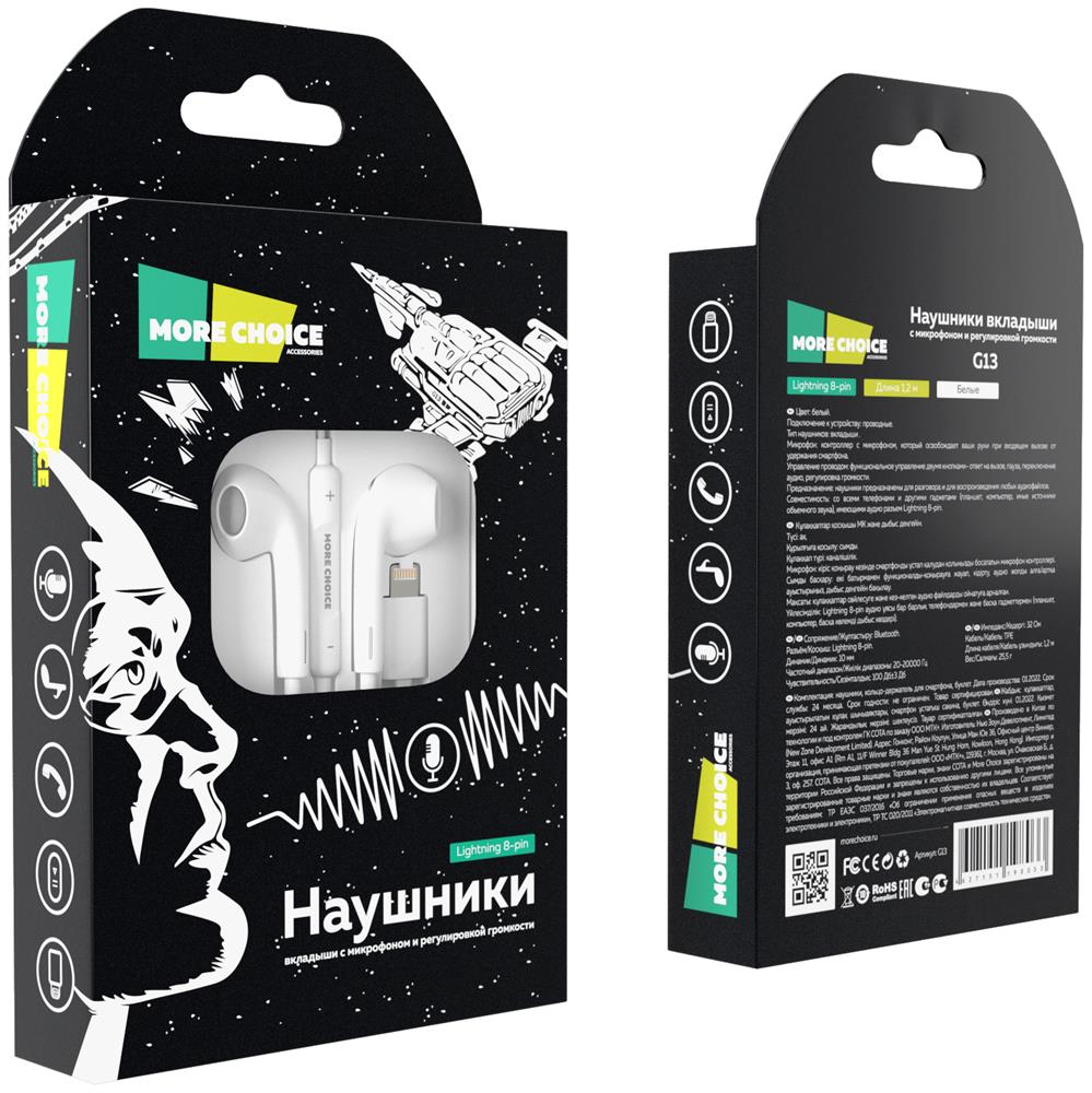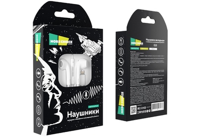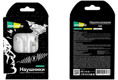 Наушники вкладыши Lighting 8-pin разъём с МК и рег.громкости длина 1.2м More choice G13 Подключение к устройству: проводные Сопряжение: Bluetooth Тип наушников: вкладыши Разъём: Lightning 8-pin Динамик: 10 мм Частотный диапазон: 20-20000 Гц Чувствительность: 100дБ±3дБ Импеданс: 32 Ом Микрофон: контроллер с микрофоном, который освобождает ваши руки при входящем вызове от удержания смартфона Управление проводом: функциональное управление двумя кнопками- ответ на вызов, пауза, переключение аудио, регулировка громкости Предназначение: наушники предназначены для разговора и для воспроизведения любых аудиофайлов Совместимость: со всеми телефонами и другими гаджетами (планшет, компьютер, иные источники объемного звука), имеющими аудио разъем Lightning 8-pin Кабель: TPE Длина кабеля: 1,2 м Вес: 25,5 г Комплектация: наушники, кольцо-держатель для смартфона, буклет. Размер упаковки: 196*90*16 мм Цвета: White
