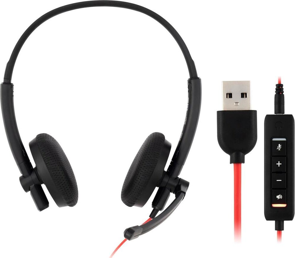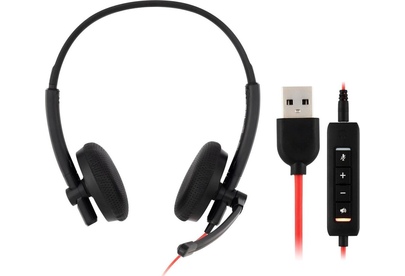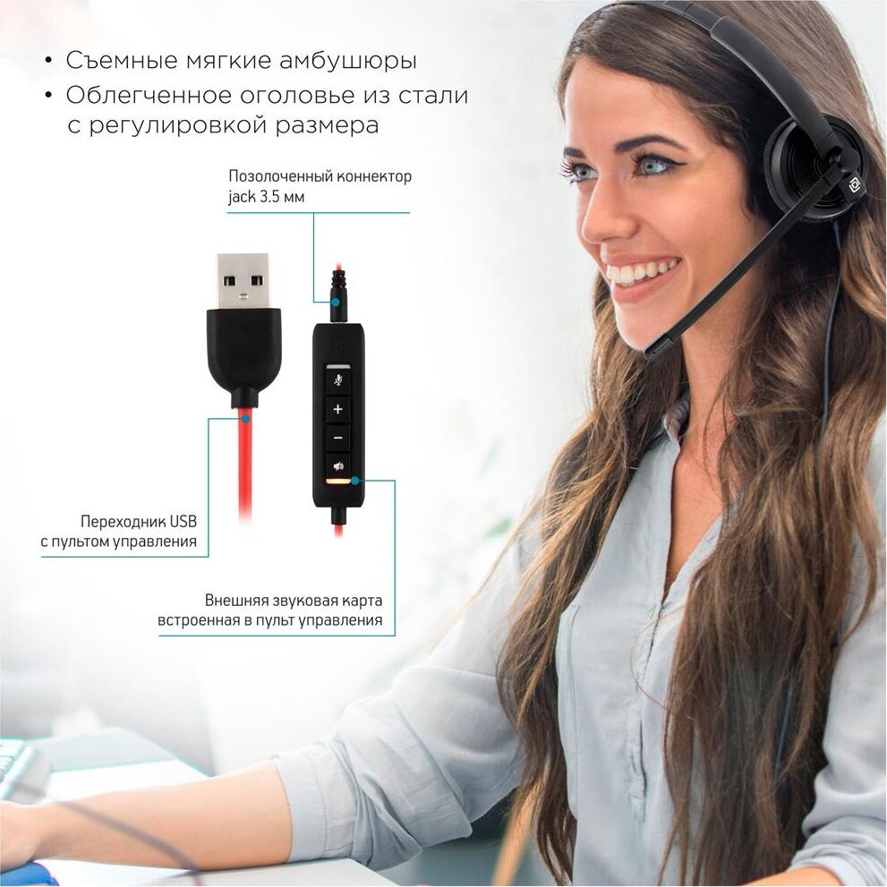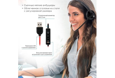 Тип гарнитуры: стерео. Тип, акустический: полуоткрытые. Тип конструкции: накладные. Тип соединения гарнитуры: проводные. Импеданс: 32. Чувствительность динамика: 96. Длина шнура: 2.8. Крепление микрофона: гибкий поворотный. Особенности: Регулируемое оголовье, дышащие мягкие амбушюры с перфорацией, широкий угол вращения микрофона, универсальное подключение - в комплекте адаптер USB / 3,5 мм с удлинителем 1.2м, удобная, легкая, офисная гарнитура с микрофоном с пассивным шумоподавлением.. Крепление: оголовье. Регулятор громкости: есть. Тип регулятора громкости: на проводе. Диаметр головок излучателей: 27. Максимальная мощность: 50. Материал магнита: NdFeB. Режим объемного звучания: Стерео 2.0. Выключение микрофона: есть. Шумоподавление микрофона: есть. Тип коннектора: прямой. Подключение кабеля: одностороннее. Переходник на 3.5 мм: есть. Вес (без шнура): 100. Длина дополнительного кабеля: 1.2. Материал амбушюров: искусственная кожа с перфорацией. Коннектор (гарнитура): 1x3.5 мм/USB. Габариты упаковки (ед) ДхШхВ: