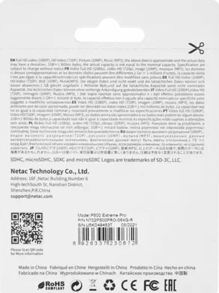 Объем памяти: 64 Гб, класс скорости: Class 10, UHS Class 3, тип: microSDXC, чтение до: 100 Мб/с, адаптер на SD, NT02P500PRO-064G-R