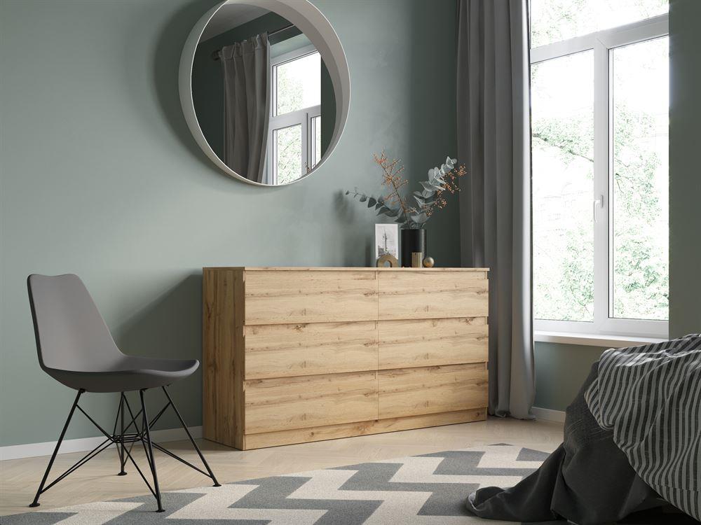 Комод с шестью ящиками. Корпус и фасад изготовлены из ЛДСП 16 мм. Три цвета на выбор - Белый, Дуб Сонома, Дуб Вотан. Функционально - широкий модульный ряд позволяет создавать любой интерьер. Эстетично - все фасады имеют скошенный край. Практично - вместительные выдвижные ящики на роликовых направляющих. Размер изделия (ШхВхГ)156,2 х 85,7 х 43,3 см.