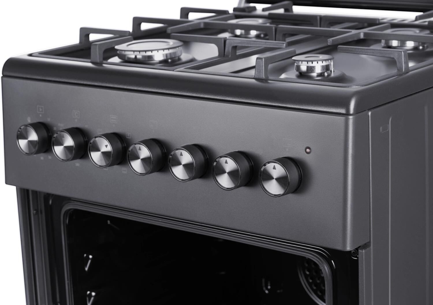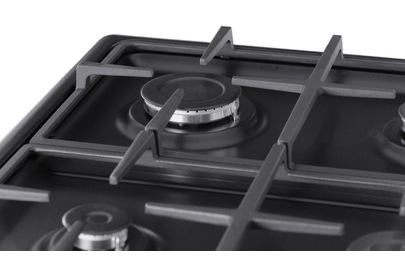 ШхГхВ: 60х60х88,5 см; 4 газовые конфорки; автоподжиг; решетка: чугунная; электрическая духовка с конвекцией: 63 л; полный газ-контроль; подсветка; гриль; отделение для хранения посуды; таймер механический; цвет: графитовый