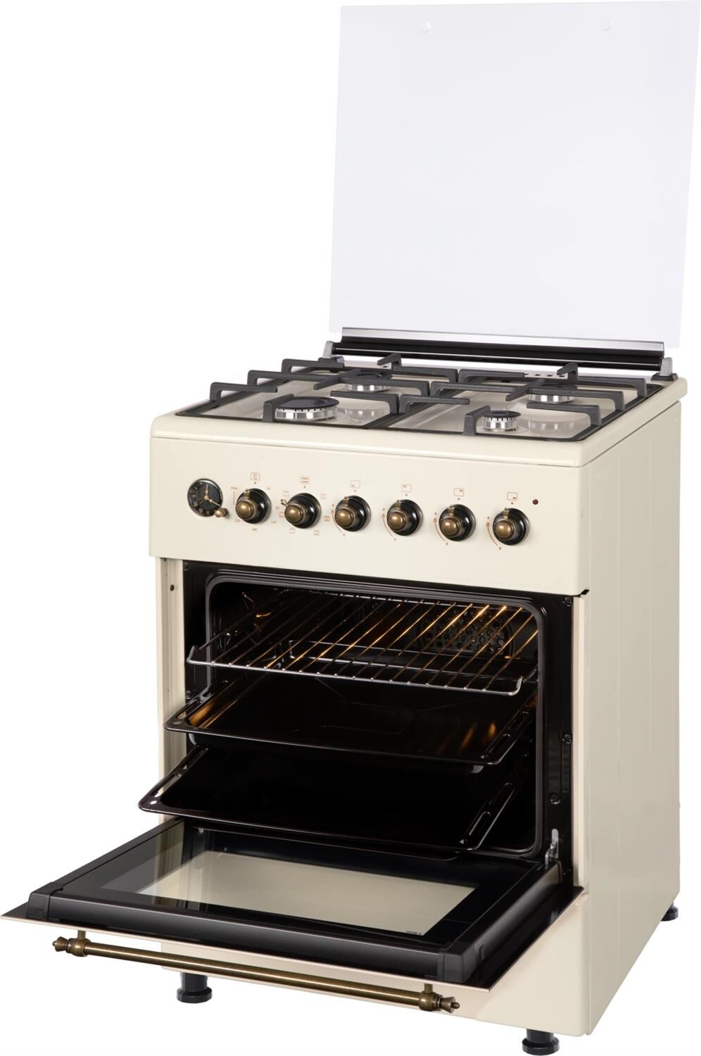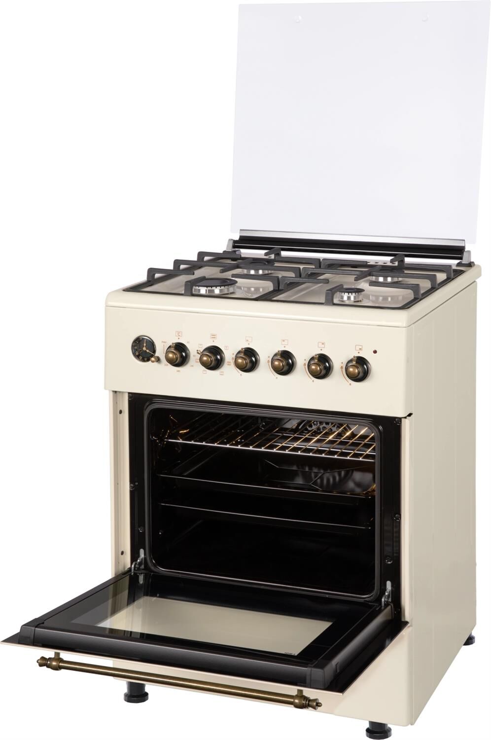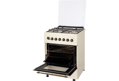ШхГхВ: 60х60х88,5 см; 4 газовые конфорки; автоподжиг; решетка: чугунная; электрическая духовка с конвекцией: 63 л; полный газ-контроль; подсветка; гриль; отделение для хранения посуды; таймер ("часы"); цвет: бежевый