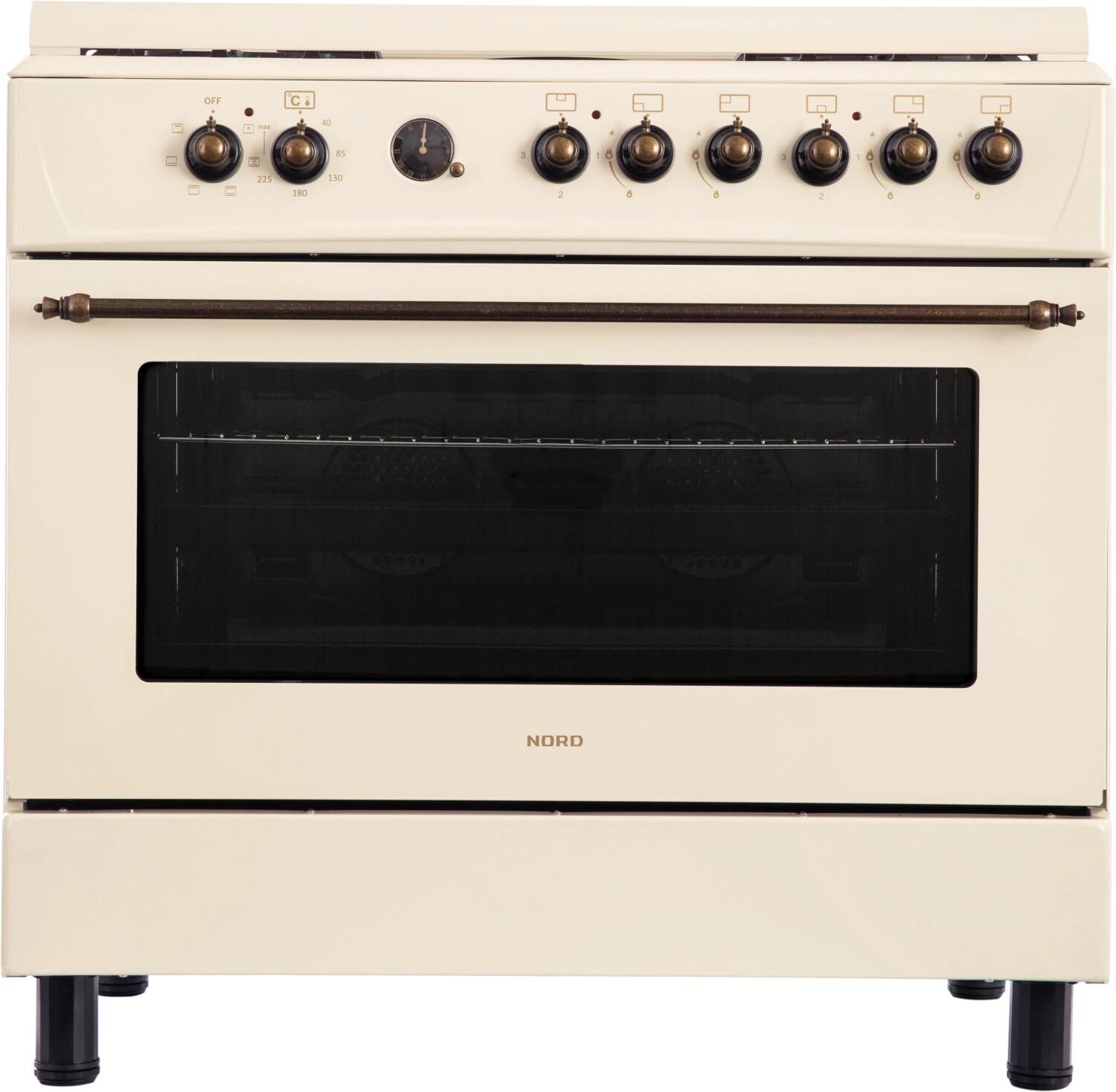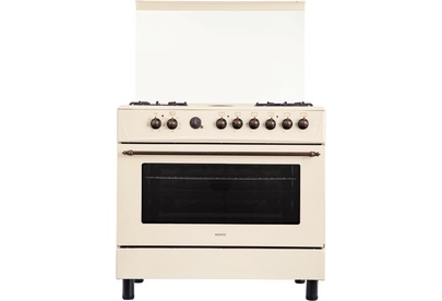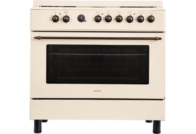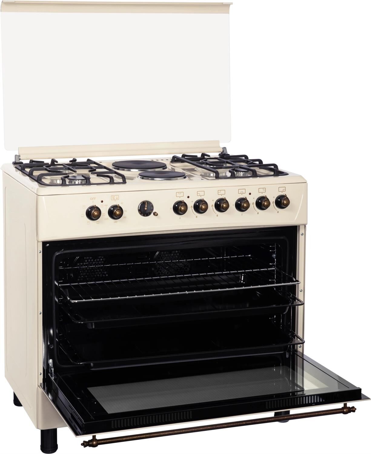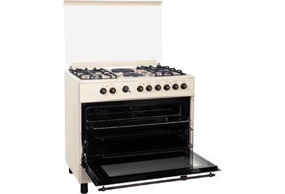 GE 9262 YR: ШхГхВ: 90х60х88,5 см; 4 газовые конфорки, 2 электрические конфорки (по 1,5 кВт); автоподжиг; решетка: чугунная; электрическая духовка с двойной конвекцией: 110л; 6 режимов; подсветка; электрогриль; отделение для хранения посуды; таймер ("часы") с автоотключением духовки; 2 противня, 1 хромированная решетка; переходник для турки; крышка: стекло; цвет: бежевый
