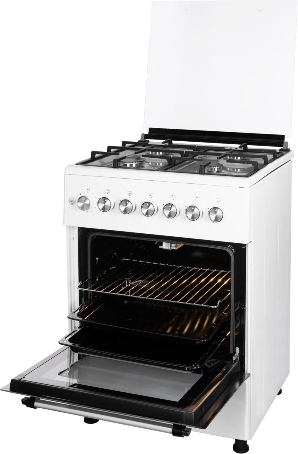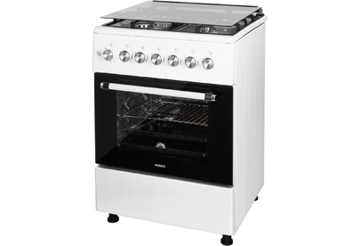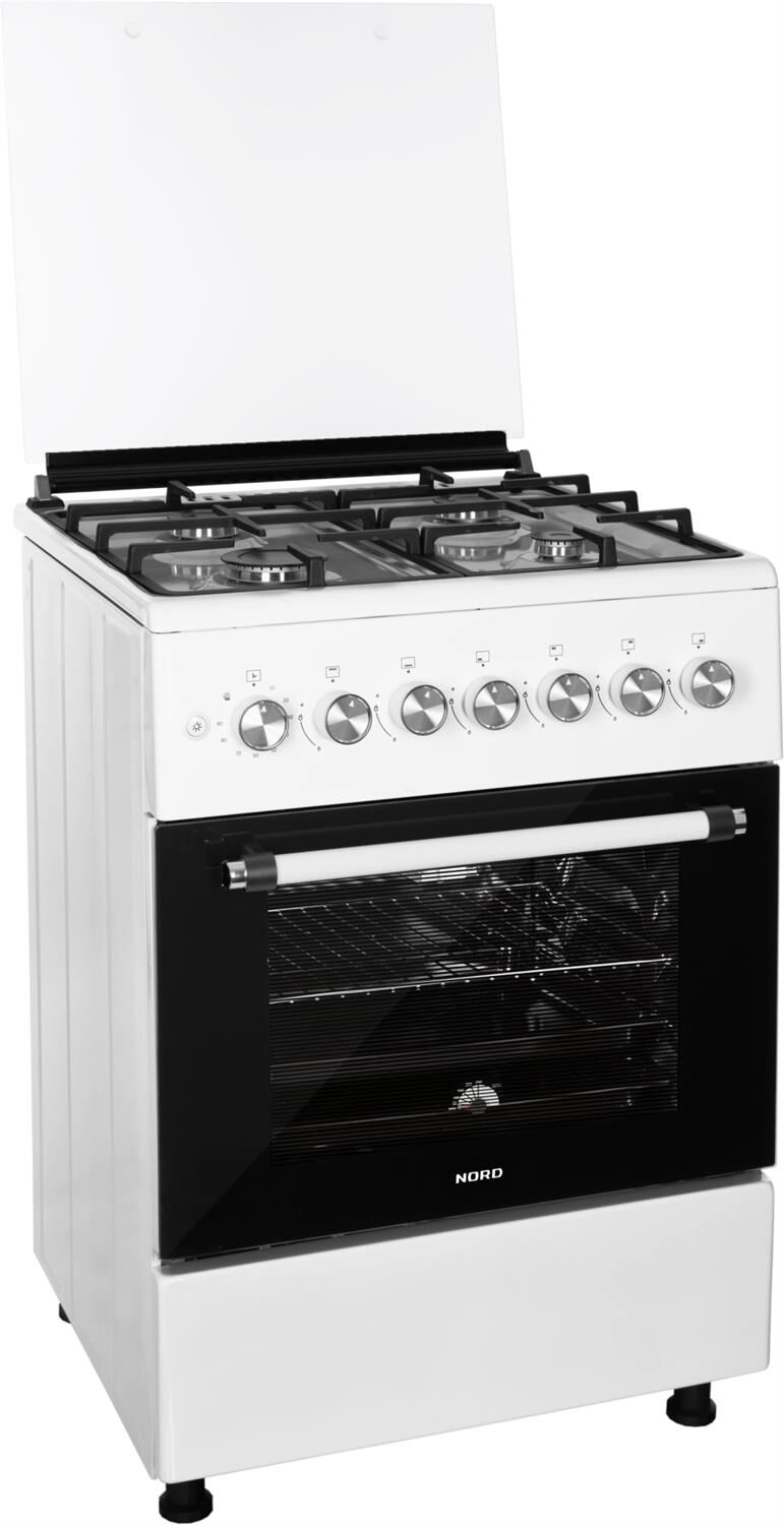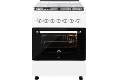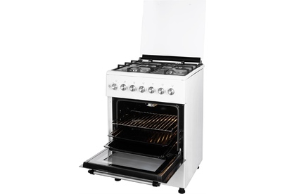 ШхГхВ: 60х60х88,5 см; 4 газовые конфорки; полный газ-контроль; автоподжиг; решетка: чугунная; газовая духовка: 63 л; 2 режима; подсветка; гриль; энергосберегающее стекло дверцы духовки; механический термометр для духовки; отделение для хранения посуды; таймер механический; 2 противня, 1 хромированная решетка; крышка: стекло; цвет: белый