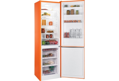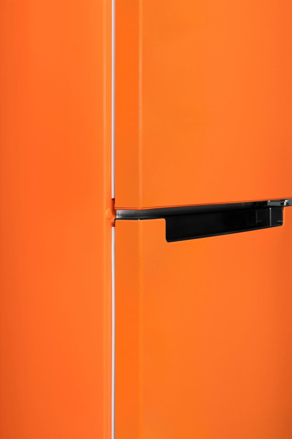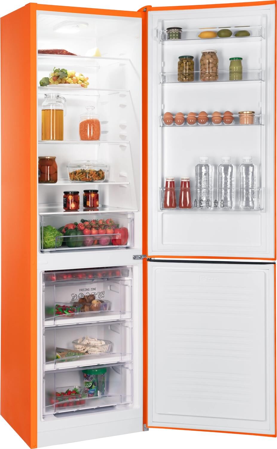 2-камерный, 343 л (ХК 238 л + МК 105 л), класс А+, LED-освещение, МК внизу, 4 полки стекло, выдвижной овощной ящик, 3 отделения в МК, 1 лоток для ягод, автоматическая система оттаивания, 203х57х62 см, цвет: оранжевый матовый