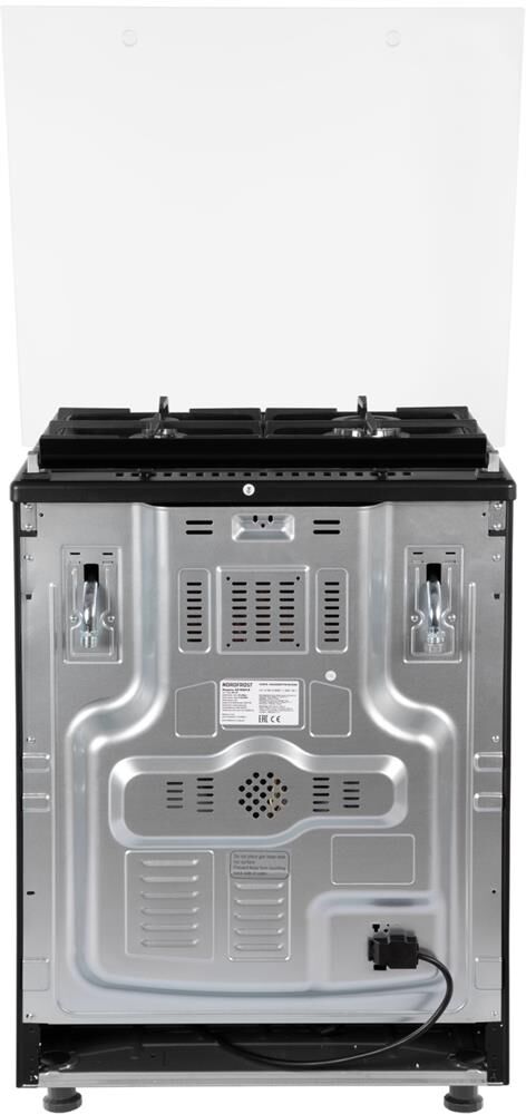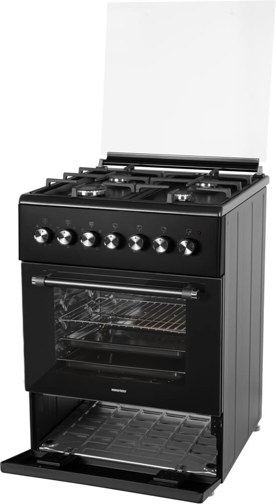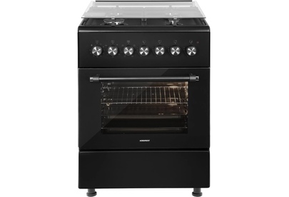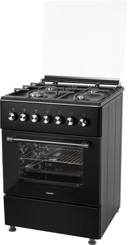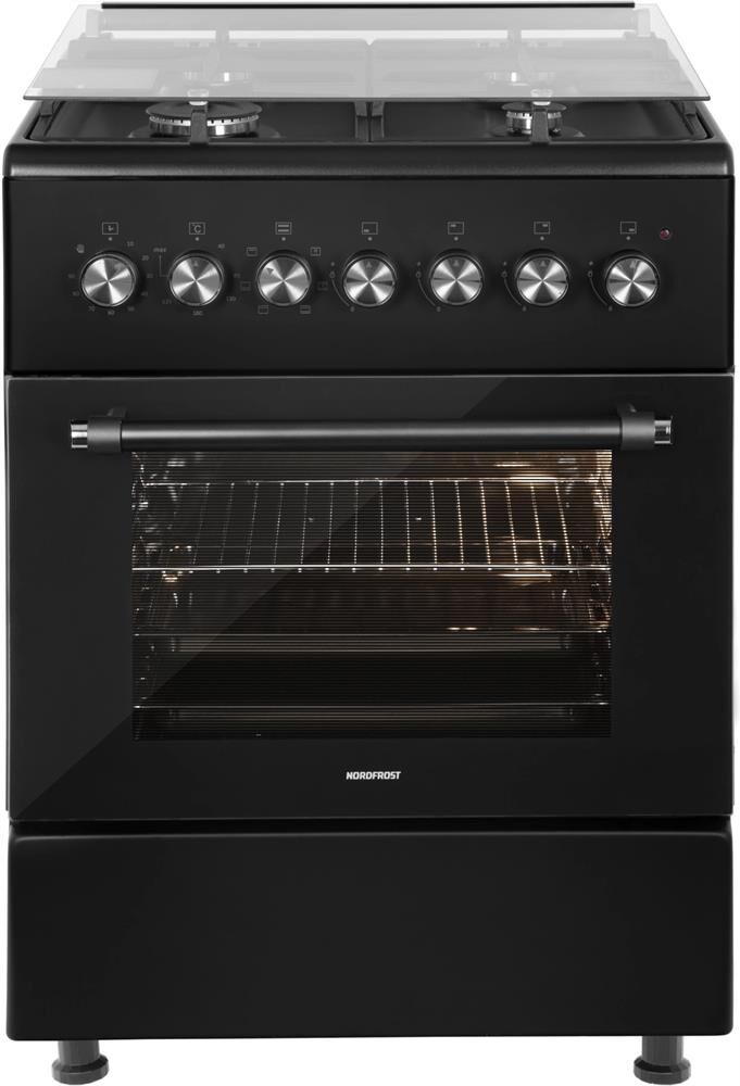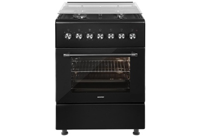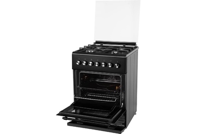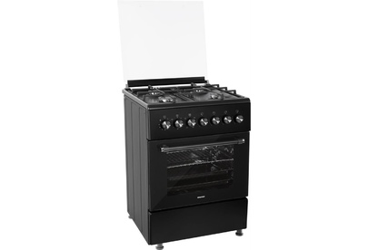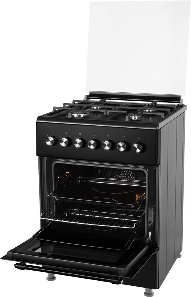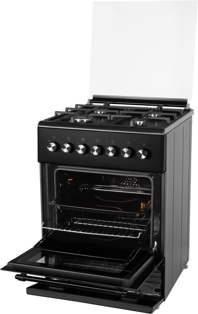 ШхГхВ: 60х60х88,5 см; 4 газовые конфорки; автоподжиг; решетка: чугунная; электрическая духовка с конвекцией: 63л; полный газ-контроль; подсветка; гриль; отделение для хранения посуды; таймер механический; цвет: черный матовый