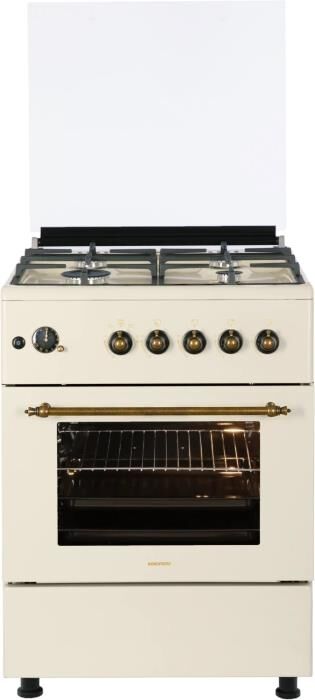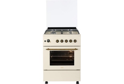 ШхГхВ: 60х60х88,5 см; 4 газовые конфорки; автоподжиг; решетка: чугунная; газовая духовка: 63 л; полный газ-контроль; подсветка; гриль; отделение для хранения посуды; таймер ("часы"); цвет: бежевый