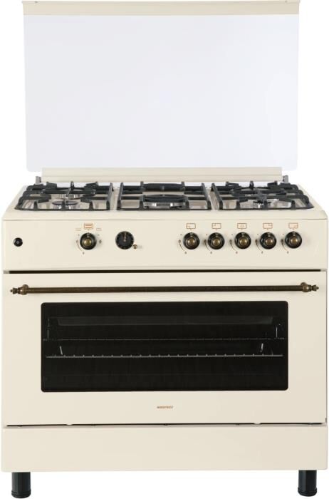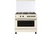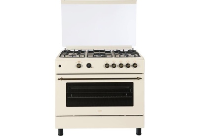 ШхГхВ: 90х60х88,5 см; 5 газовых конфорок; автоподжиг; решетка: чугунная; газовая духовка: 110 л; полный газ-контроль; подсветка; гриль; отделение для хранения посуды; таймер ("часы"); цвет: бежевый