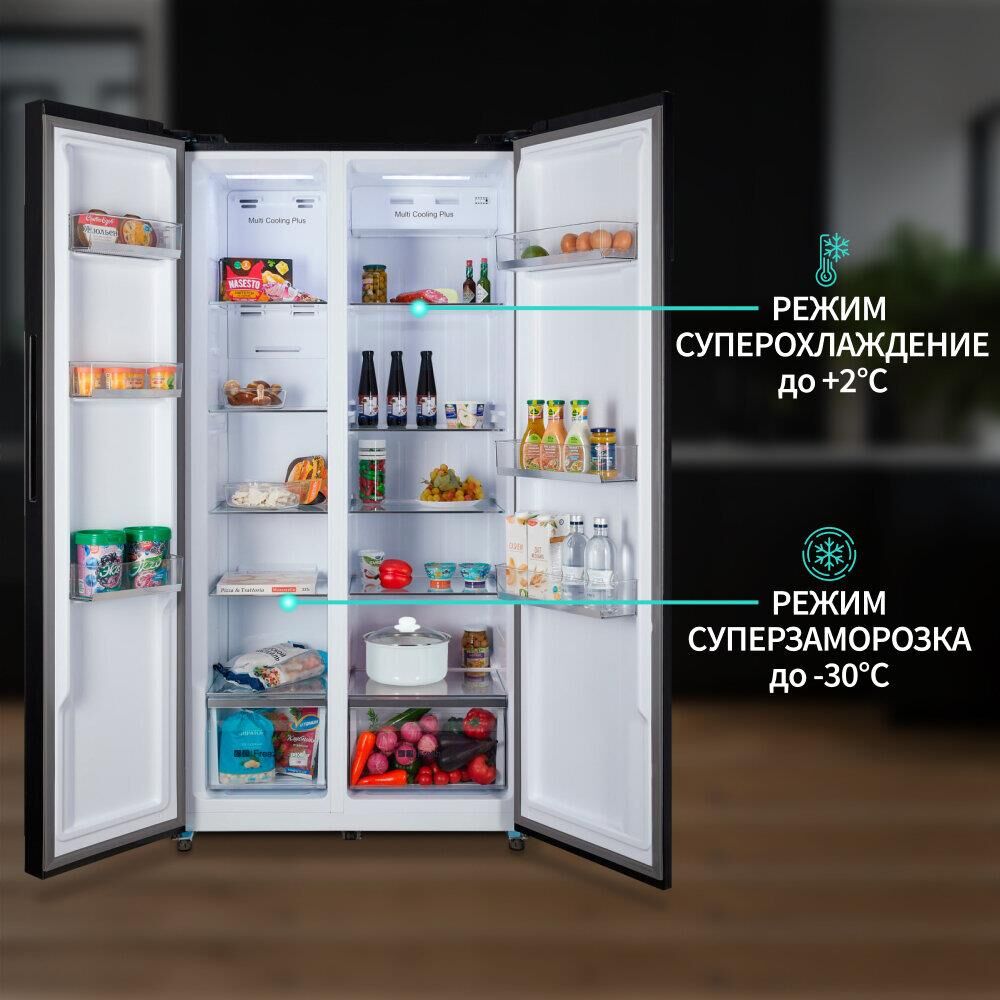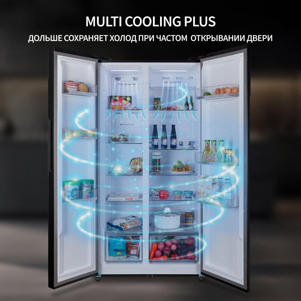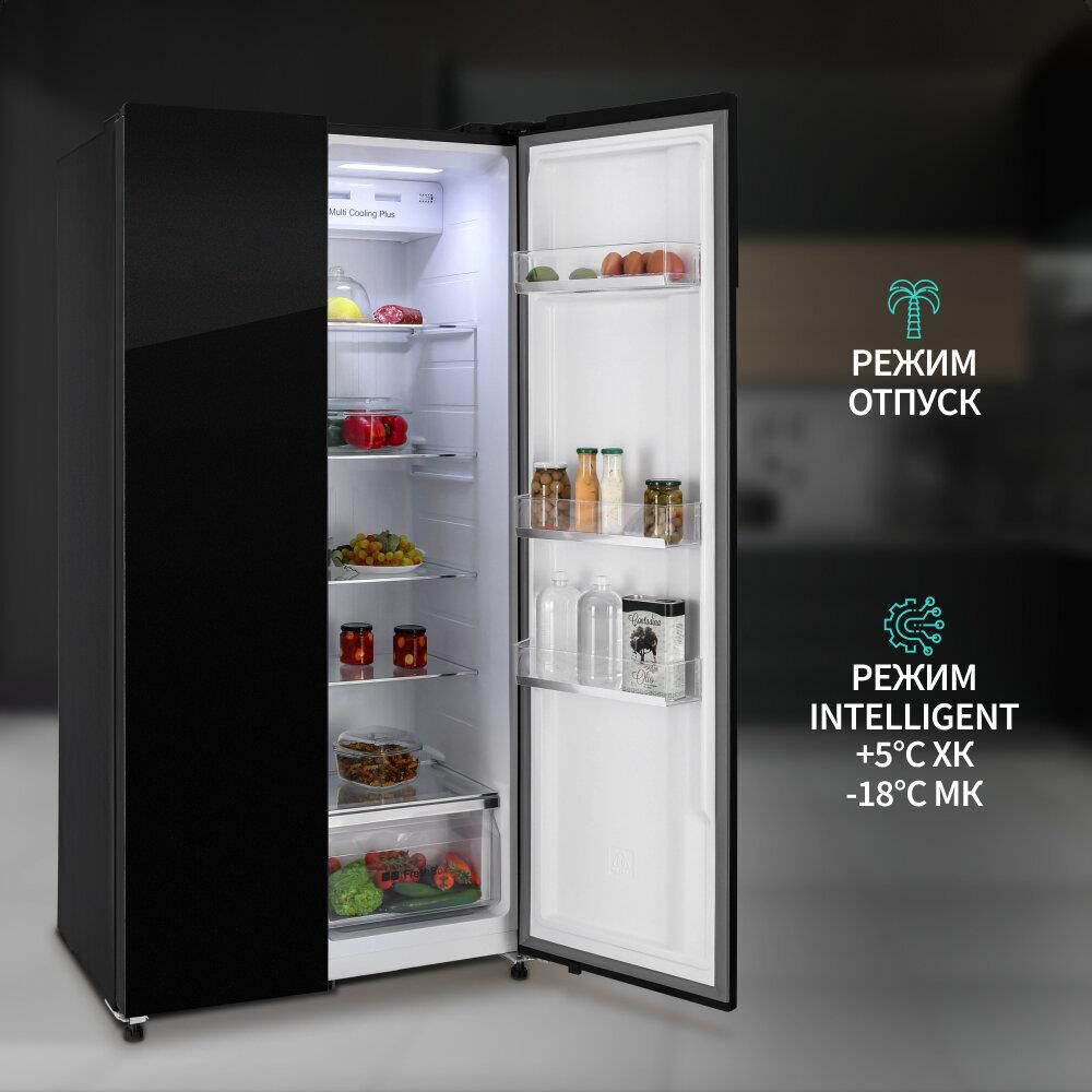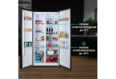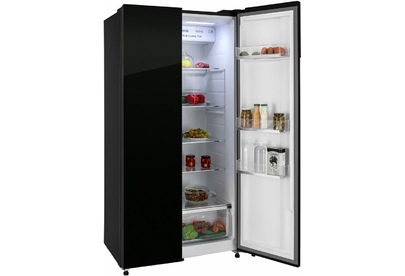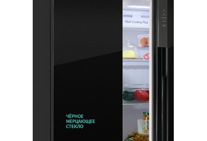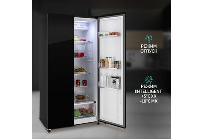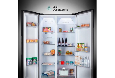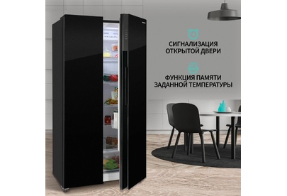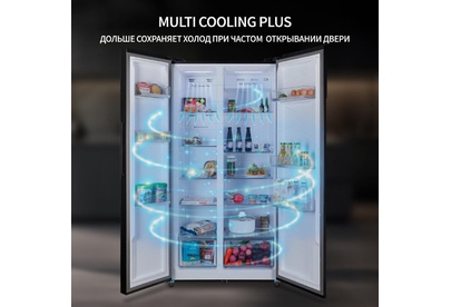 INVERTER NoFrost; Side-by-side ; ШхГхВ: 910x600x1836 мм; V=525/466 л (283л/183л); Класс A+; Фреон R600a; Клим. кл. SN, T; 39 дБ; LED освещение. Электронный дисплей. Дверь: Черное стекло. Боковые стенки: черные