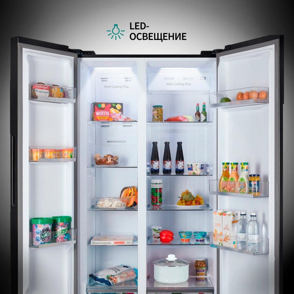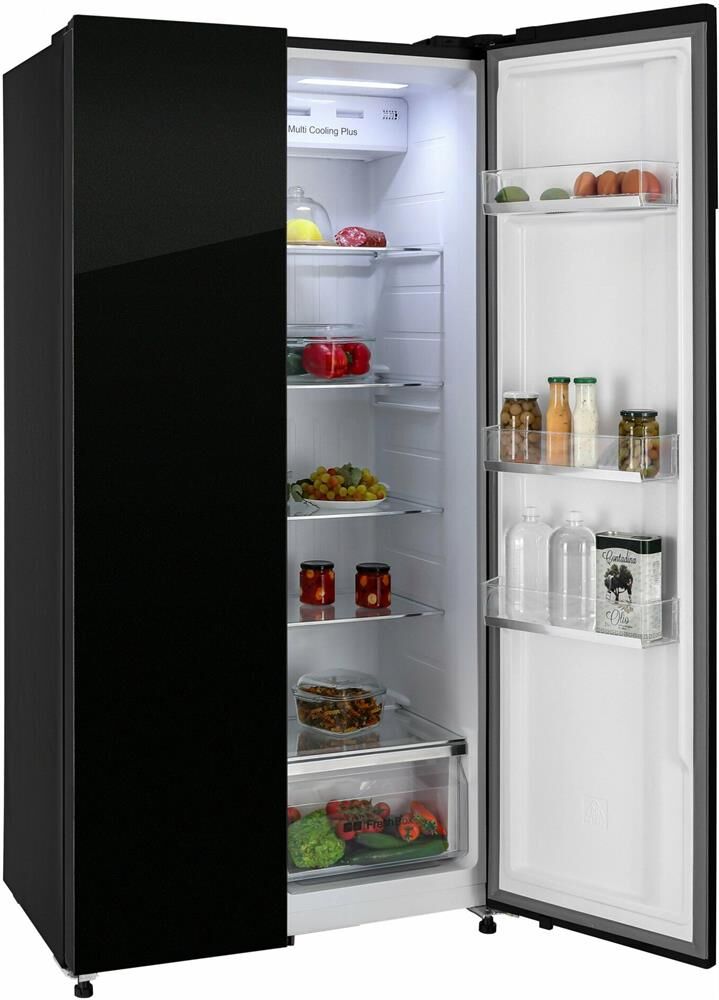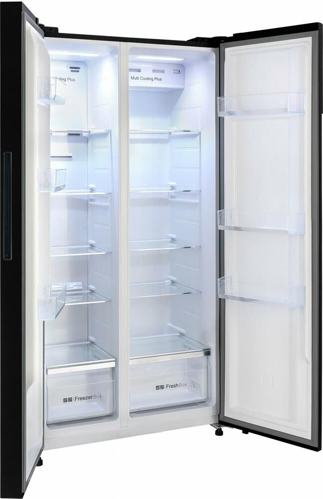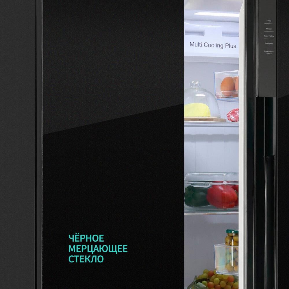 INVERTER NoFrost; Side-by-side ; ШхГхВ: 910x600x1836 мм; V=525/466 л (283л/183л); Класс A+; Фреон R600a; Клим. кл. SN, T; 39 дБ; LED освещение. Электронный дисплей. Дверь: Черное стекло. Боковые стенки: черные