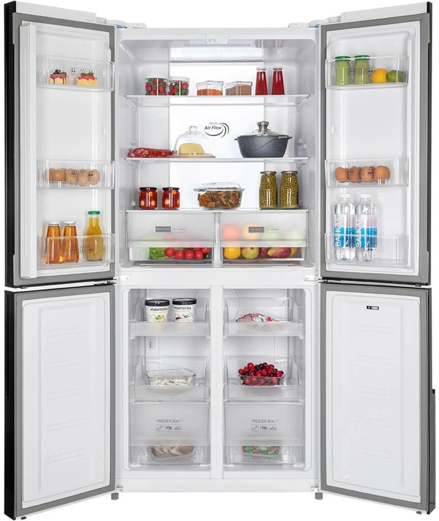 Количество камер: трехкамерный. Расположение морозильной камеры: снизу. Тип управления: электронное. Класс энергопотребления: A+. Система размораживания: No Frost. Общий объем холодильника: 470. Уровень шума: 41. Количество компрессоров: один. Хранение при отключении питания: 11. Мощность замораживания: 7. Количество полок: 3. Количество ящиков: 2. Материал полок: закаленное стекло. Зона свежести: есть. Количество полок: 4. Система размораживания: No Frost. Тип: Холодильник. Полезный объем холодильника: 427. Полезный объем холодильной камеры: 286. Полезный объем морозильной камеры: 141. Хладагент: R600a. Количество ящиков: 2. Вес (нетто): 87. Количество дверей: 4. Тип компрессора: инверторный. Габариты упаковки (ед) ДхШхВ: 0.88x0.71x1.891. Вес упаковки (ед): 94. Страна производства: Китай. Инверторный компрессор: есть. Количество полок на дверце: 6. Материал дверей: стекло. Наличие морозильной камеры: есть. Температура морозильной камеры max: -15. Температура морозильной камеры min: -24. Температура холодильн