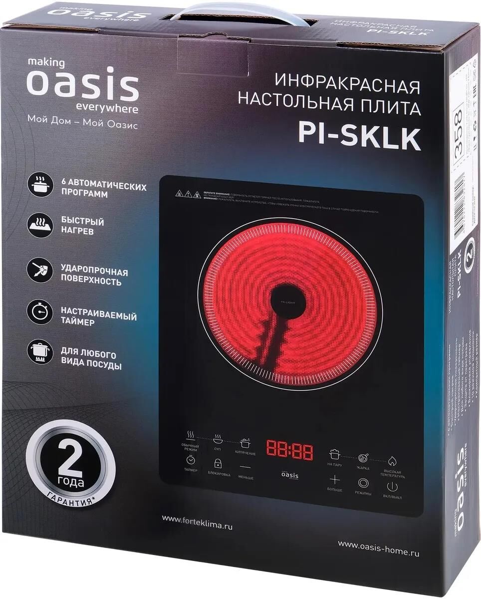 Тип настольнойплиты Электрическая Тип конфорки электрической настольнойплиты инфракрасная Управление сенсорное Дисплей есть Варочная поверхность Материал рабочейповерхности стеклокерамика Количество электрическихконфорок 1 Конфорка мощность 2000 Вт , диаметр200 мм Особенности Количество режимов регулировкитемпературы 10 Количество программприготовления 6 Программыприготовления *Обычный режим *Суп *Кипячение *На пару *Жарка *Максимальный режим Максимальный веснагрузки 10 кг Таймер есть Типтаймера электронный Индикаторработы есть Индикаторы остаточноготепла есть Встроенныйтермостат есть Звуковойсигнал есть Защита отперегрева есть Блокировка отдетей есть Защитноеотключение есть Прорезиненныеножки есть Длина шнурапитания 1.3 м Размеры и цвет Цвет черный Размеры(ШхВхГ) 28 x 6.4 x 36 см Вес 2.2 кг