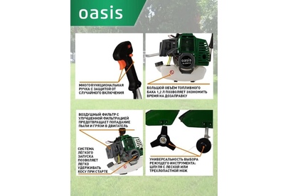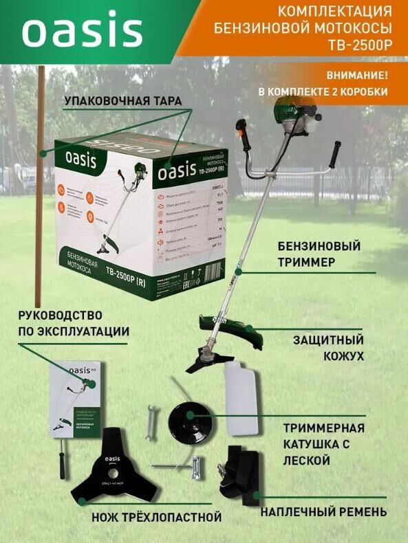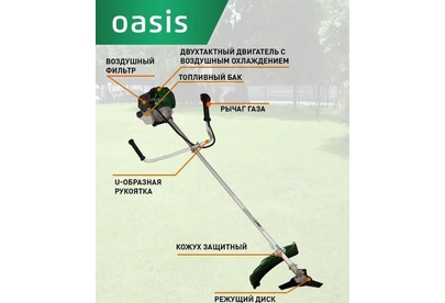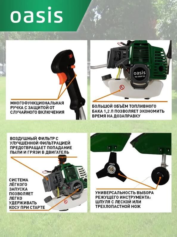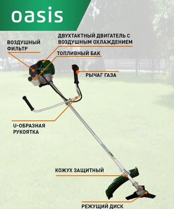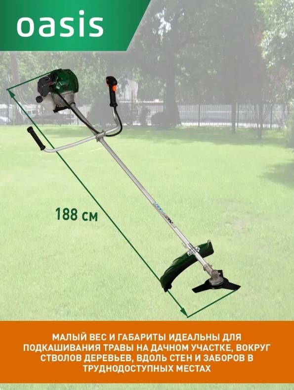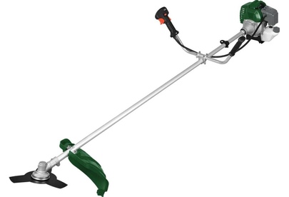 Мощность 2500/3,3 Вт/л.с; Объем двигателя 51,7; средний расход топлива 700 г/кВт.ч, скорость вращения шпинделя 7500 об.мин, объем топливного бака 1.2л, тип зажигания - электронное, тип бензина (рекомендованный) - 92, ширина кошения кордом 430мм, ширина кошения ножом 255мм, уровень шума 96 дБ, тип штанги - Цельная, тип рукоятки - Велосипедная, Вес 7кг.