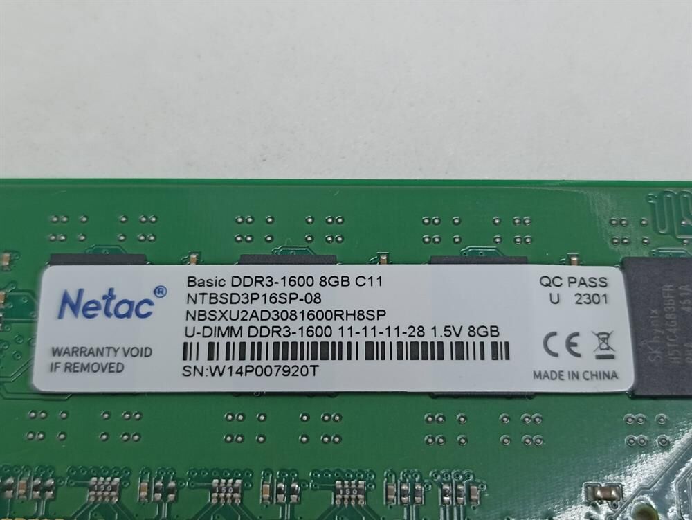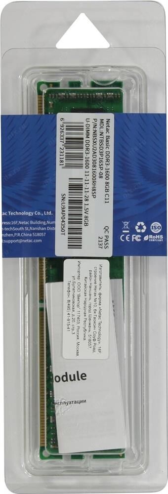 Оперативная память NETAC Модуль памяти DDR3 Basic 8GB 1600MHz CL11 1.5V / NTBSD3P16SP-08