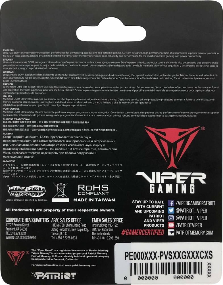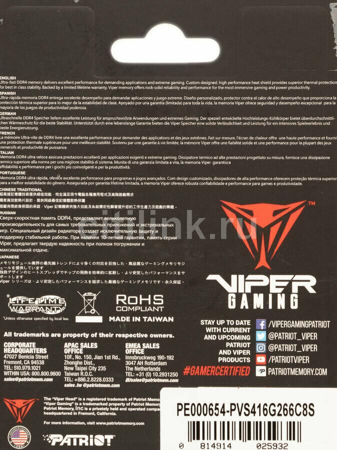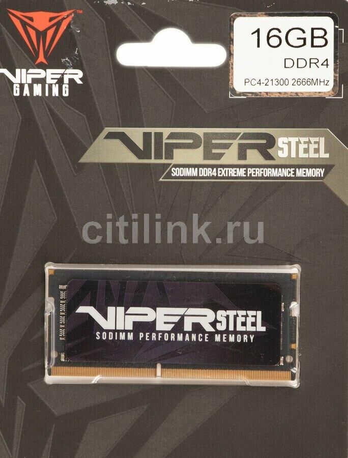 Оперативная память PATRIOT Память DDR4 16GB 2666MHz PVS416G266C8S Viper Steel RTL PC4-21300 CL18 260-pin 1.2В single ra