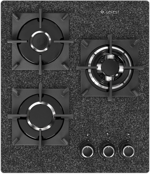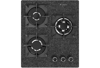 Варочная панель шириной 45 см, стеклянная поверхность с нанесенной текстурой камня, в черном цвете. Три газовые конфорки установлены на широком основании и надежно защищены от повреждений индивидуальными чугунными решетками. Мощность от 1 кВт до 3,2 (двухзонная горелка), плавная регулировка горения вплоть до минимально возможного. Есть газ-контроль и автоматический электроподжиг, для удобства готовки элементы управления смещены вбок.