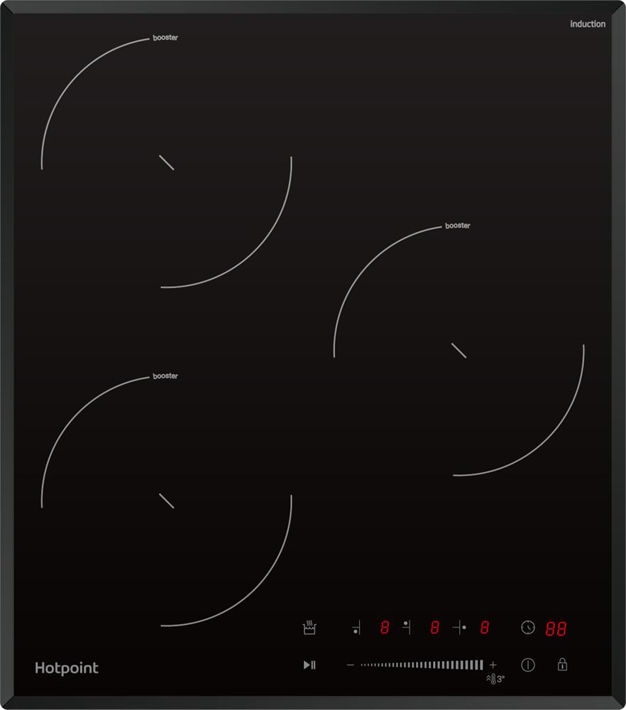 Индукционная варочная поверхность шириной 45см, 3 зоны нагрева, функция быстрого нагрева Booster, 9-ступенчатая регулировка мощности, слайдерное упрвление, таймер на 99 минут, функция блокировки управления, индикация остаточного тепла, скошенные края по п