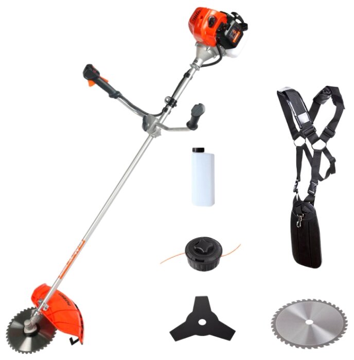 Мощность двигателя, л.с. 3. Объем двигателя, см3- 52. Тип двигателя 2-х тактный бензиновый. Диаметр режущей лески, мм 3. Диаметр режущего ножа, см 25.5. Пильный диск 40Т+3Т. Ширина скашивания, см 42. Тип рукоятки U-образная (велосипедная). Приводной вал жесткий. Легкий старт . Тип топлива смесь 32: 1 (бензин АИ 92 + масло Patriot G-Motion). Объем топливного бака, л 0,95.