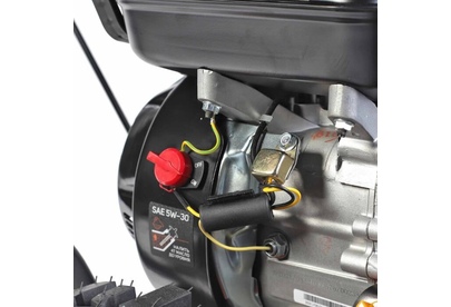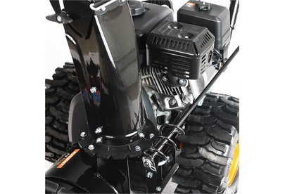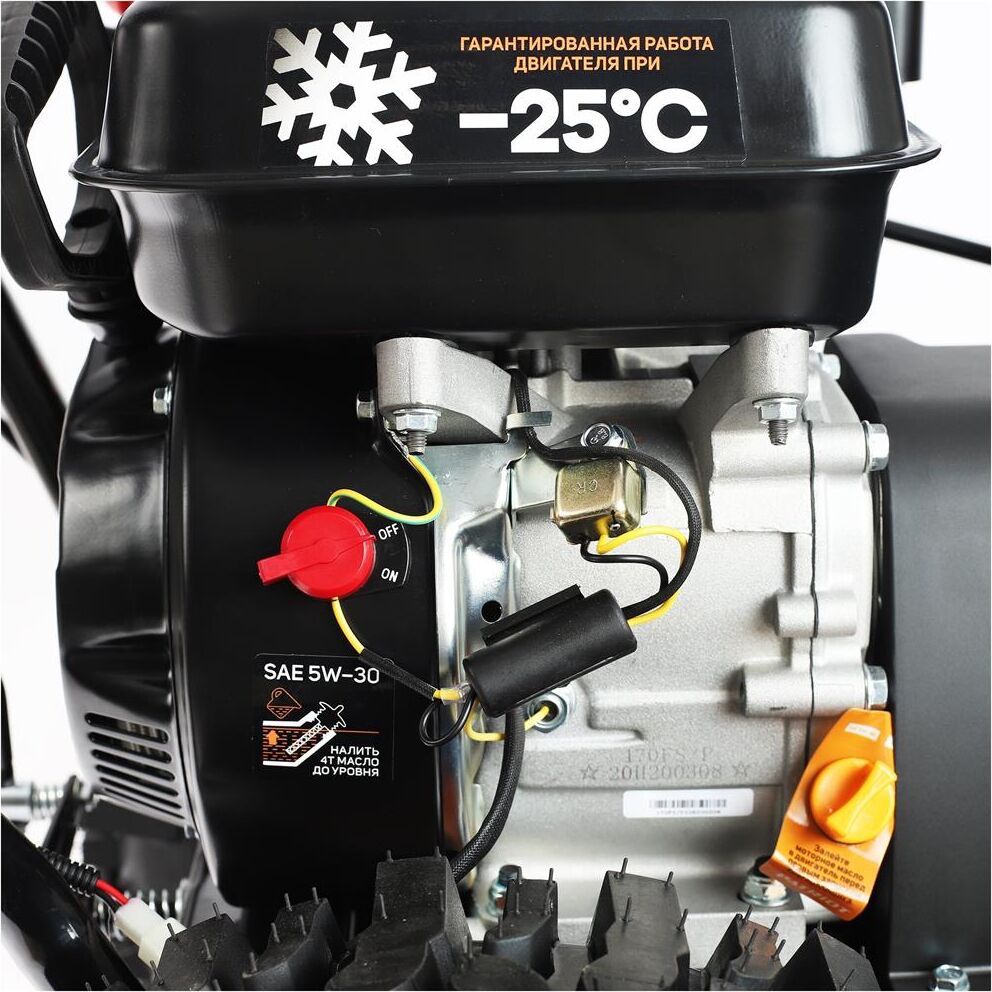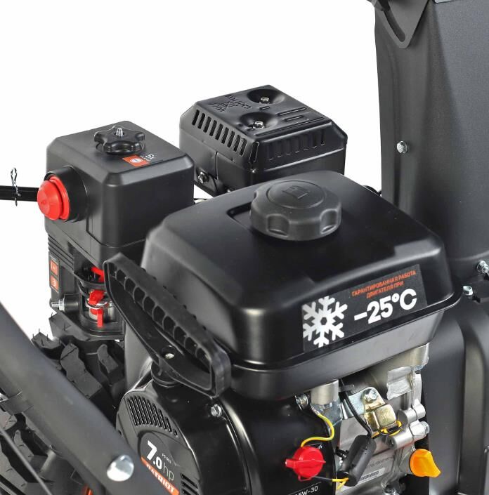 гарантированная работа двигателя при -25 ⁰ C, направление выброса снега 70⁰ , тип топлива: бензин АИ-92, емкость масляного картера 0.6 л, тип колес: Winter Extreme