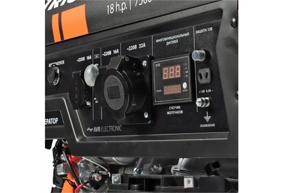 Объем двигателя, см3 485, Макс. мощность, л.с. 18, Тип топлива АИ-92, Объём бака, л 25, Тактность двигателя 4-х тактный, Номинальное напряжение, В 220, Мощность ном/макс, кВт 7.0/7.5, Расход топлива, г/кВт 490, Уровень шума, dB 80, Стартер ручной/электро/автозапуск +АКБ, Вольтметр электронный мультидисплей, Розетки 2 евро 16А, 1 евро 32А, Комплект для транспортировки опция, Выход на 12B