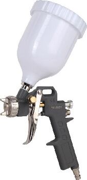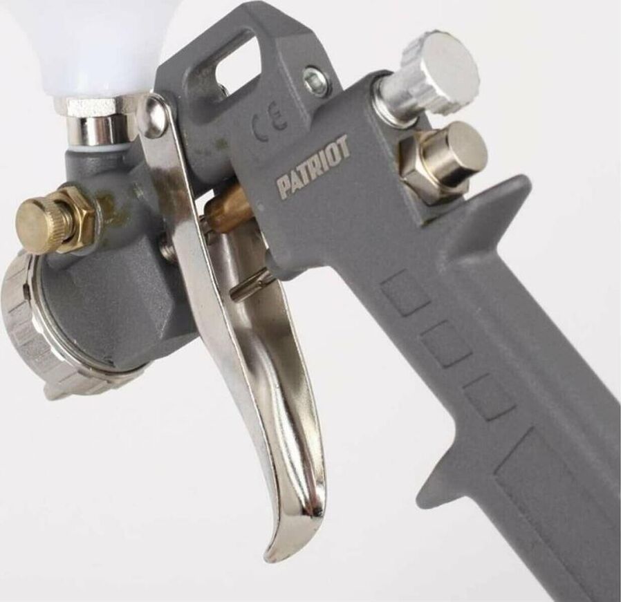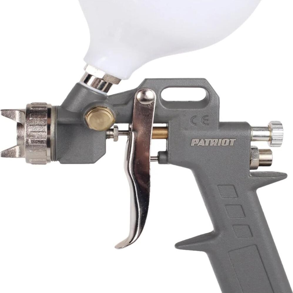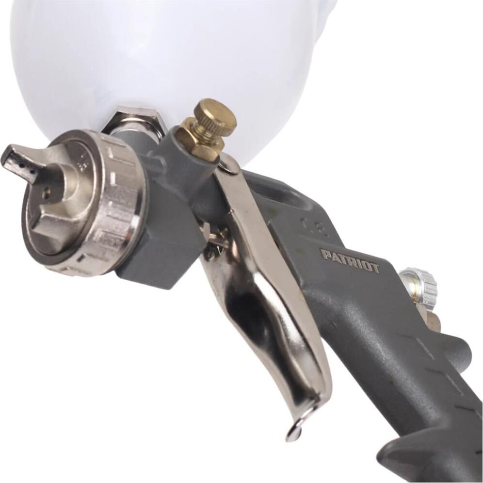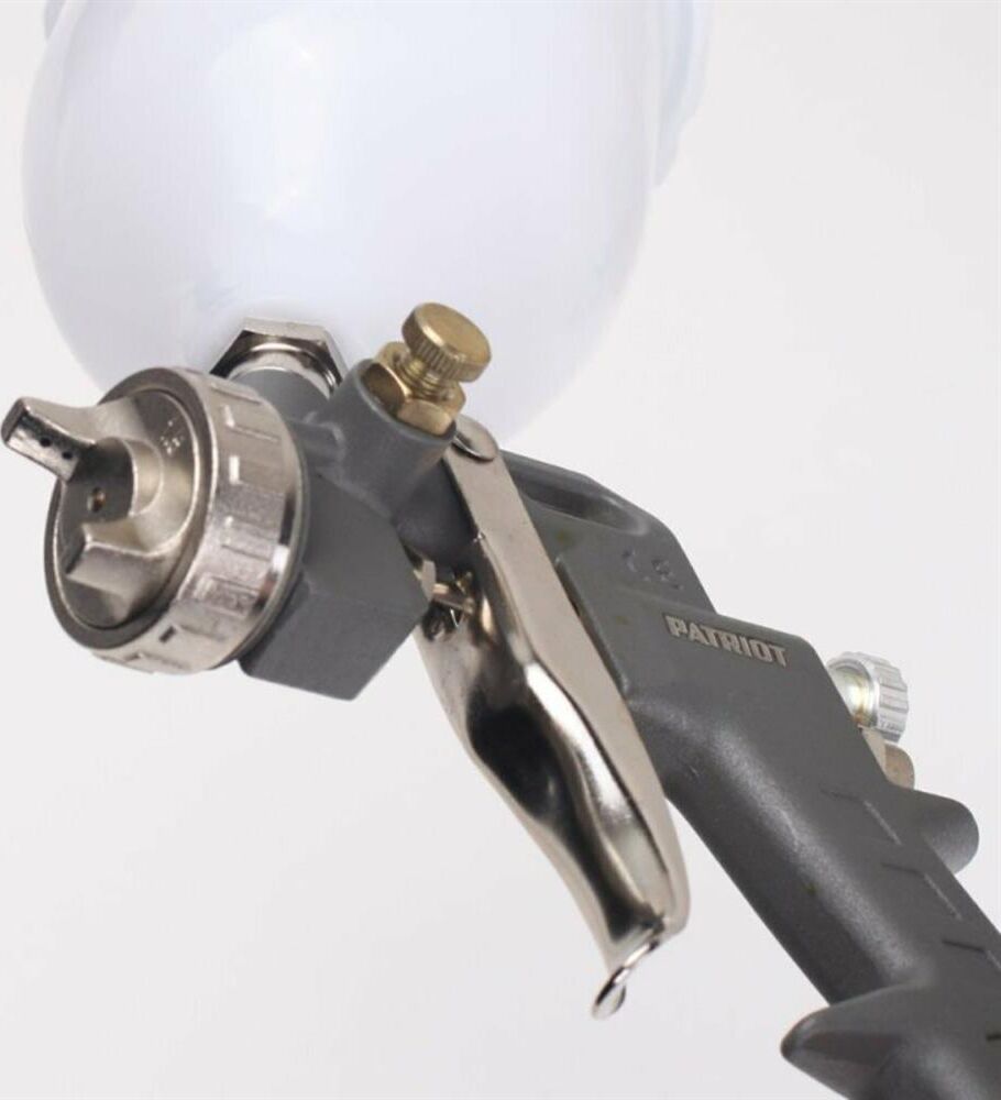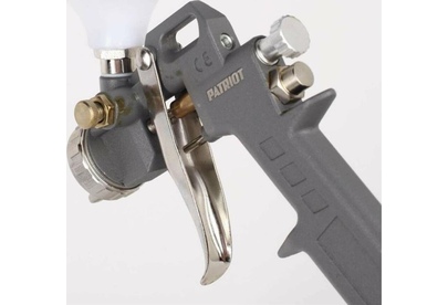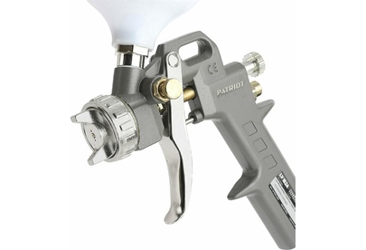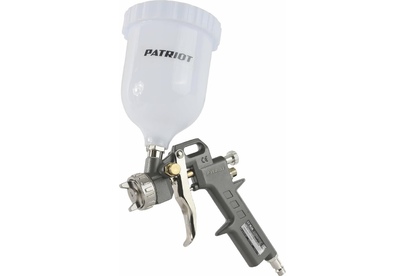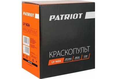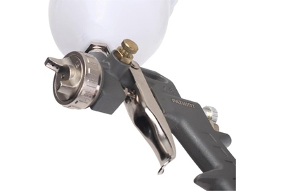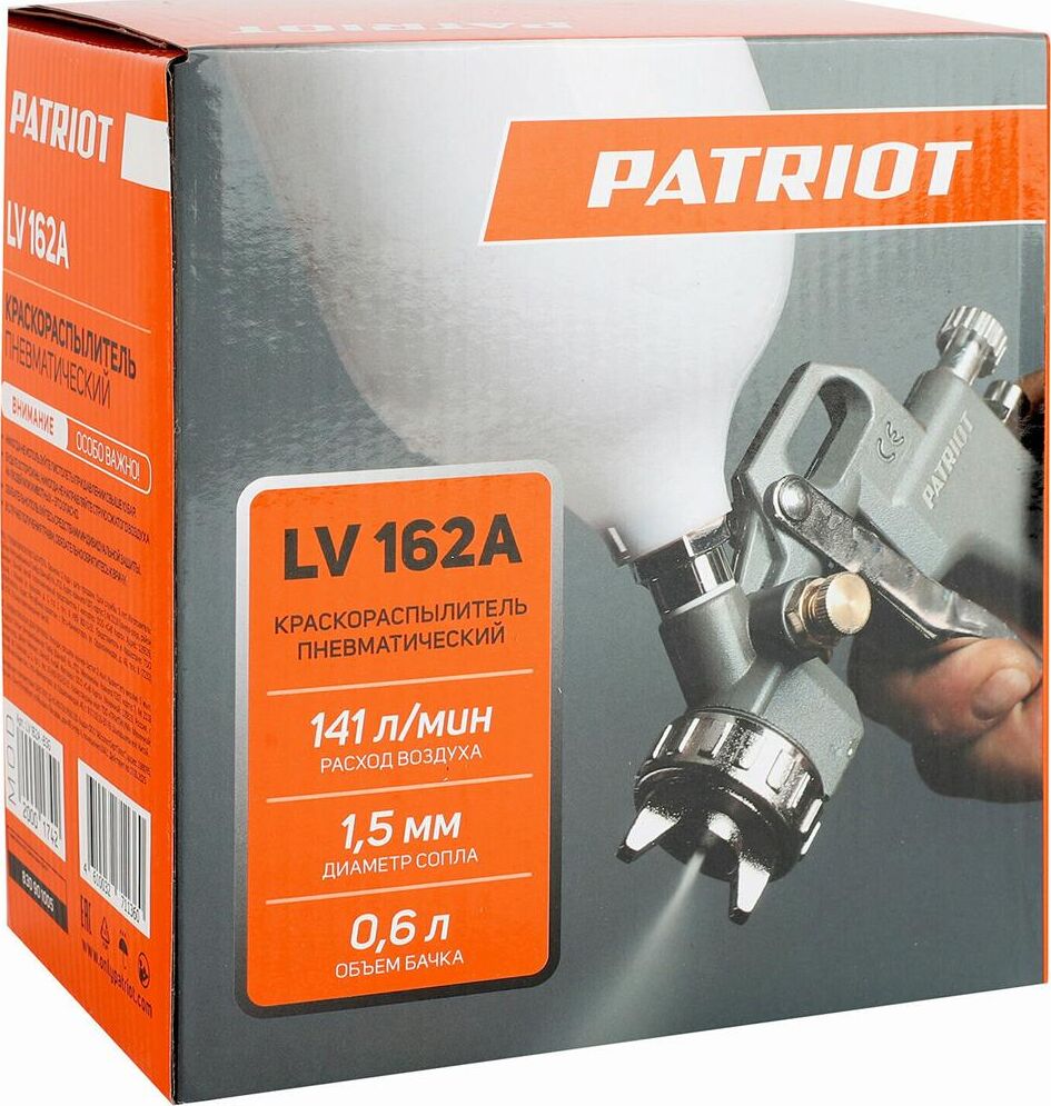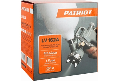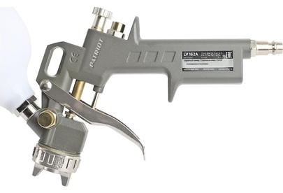 Пневмокраскораспылитель PATRIOT LV 162А, Расход воздуха: 400 л/мин; Объем бачка для краски: 0.5 л. верхний; Давление: 3.0-4.0 бар; Диаметр сопла: 1,5 мм; Ширина факела: 120-220 мм; Соединение: быстросъем.