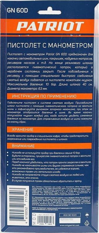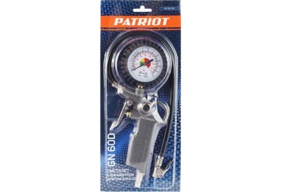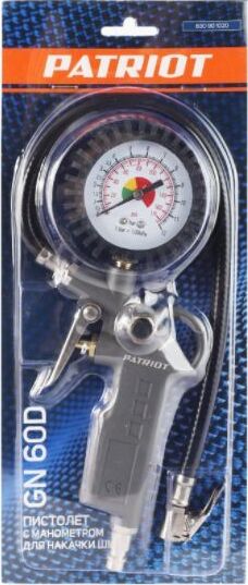 Пистолет для накачки шин PATRIOT GN 60D, Максимальное давление: 10 бар; Длина шланга: 360 мм; Диаметр манометра: 63 мм; Соединение: быстросъем.