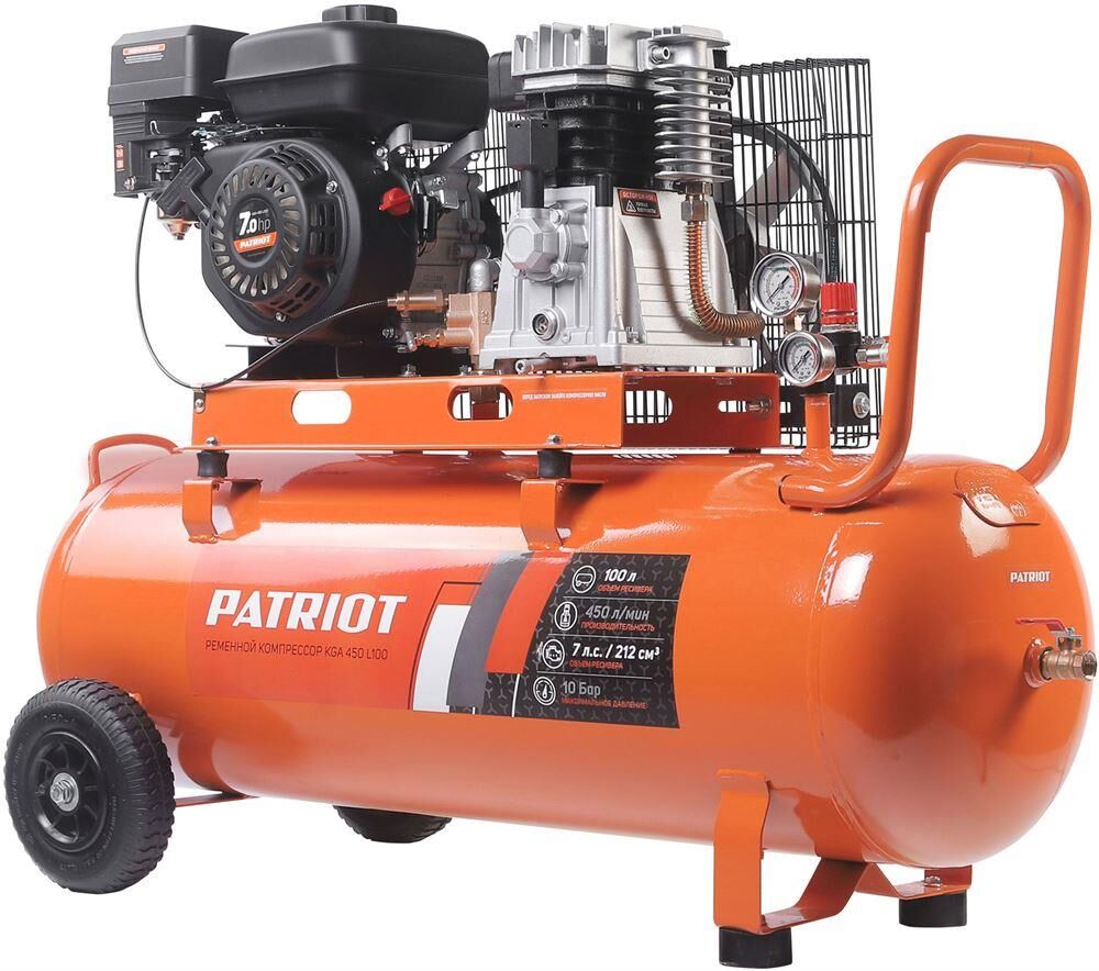 Компрессор воздушный масляный PATRIOT KGA 450 L100 бензиновый поршневой ременной понадобится там, где нет доступа к электросети или мощности сети недостаточно. Эффективен для автономных и мобильных строительных, ремонтных и покрасочных работ с различным пневмоинструментом, подойдет для продувки водопроводов на больших территориях. Обеспечивает стабильную работу в любых условиях. Справится любой пользователь Легкий запуск двигателя. Высокая производительность Объем ресивера 100 литров и производительность 450 л/мин. Долгая автономная работа Высокопроизводительная помпа и эффективная система охлаждения. Для разных задач Работает без доступа к электросети, идеален для мест с ограниченной мощностью. Подходит даже для запуска больших асинхронных двигателей. Экономный расход Система управления ходом двигателя способствует снижению расхода топлива. Низкий уровень шума Не требует дополнительных мер по звукоизоляции. Два разъема Быстросъемный разъем RAPID и шаровый кран с переходником на соединение типа «елочка». Защи