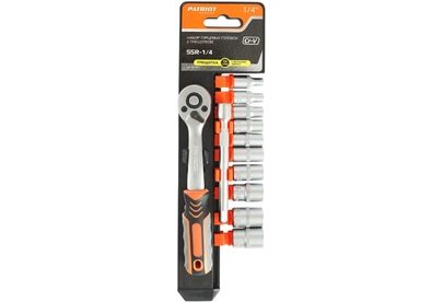 Набор торцевых головок PATRIOT SSR-1/4 для слесарно-монтажных работ. Состав комплекта: трещотка с 72 зубцами, удлинитель на 100 мм и 10 головок размером: 4,5,6,7,8,9,10,11,12 и 13 мм. Присоединительные квадраты: 1/4 дюйма. Все инструменты изготовлены из износостойкой углеродистой стали. Прорезиненная рукоять трещотки не выскальзывает из рук при работе.