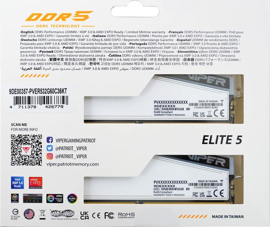 PATRIOT Оперативная память Viper Elite 5 Tuf Gaming PVER532G60C36KT DDR5 - 2x 16ГБ 6000МГц, DIMM, Re