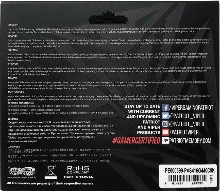 PATRIOT Оперативная память Viper Steel PVS416G360C8 DDR4 - 1x 16ГБ 3600МГц, DIMM, Ret