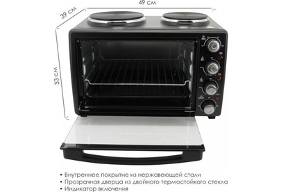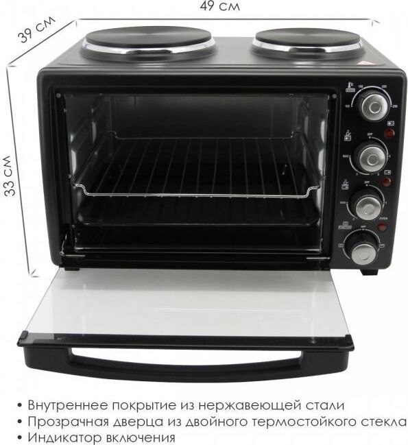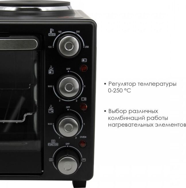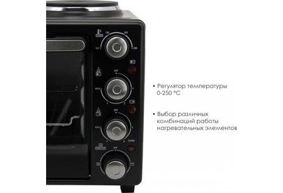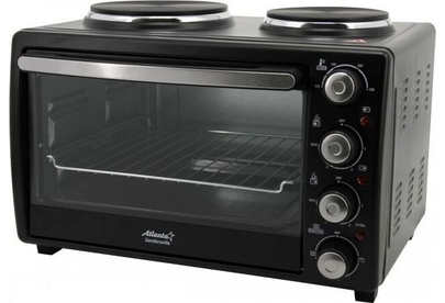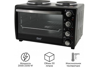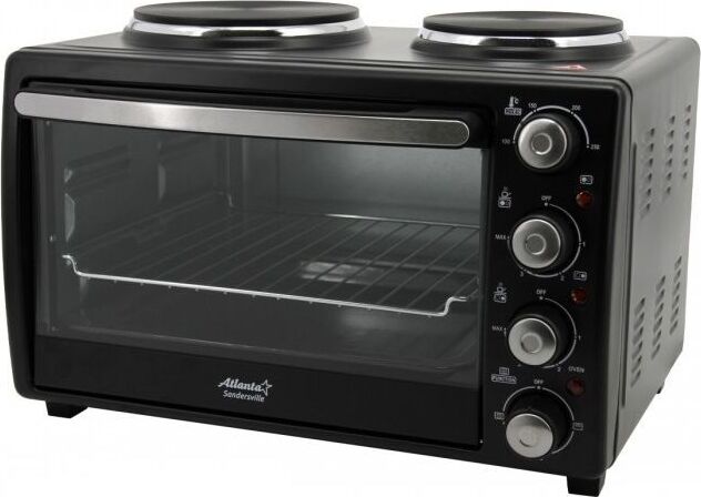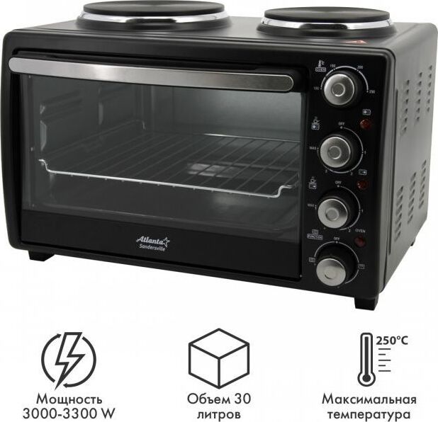 ATLANTA ATH-1410 (BLACK) Объём 30 литров Варочная поверхность Выбор различных комбинаций работы нагревательных элементов Регулятор температуры 0-250 °C Защита от перегрева Световой индикатор работы Кабель питания 80см Номинальная мощность 3200 Вт 230 B ~ 50 Гц