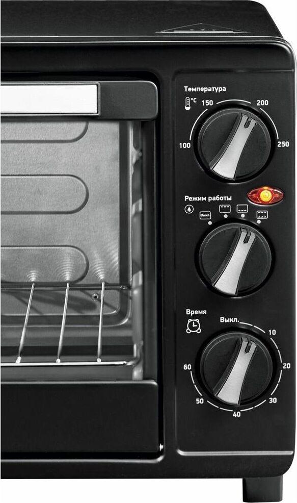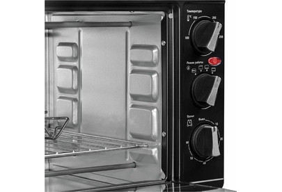 23 л, механическое упр., 1500 Вт, таймер 60 минут со звуковым сигналом, регулировка температуры 100-250 С, функции: гриль, жарка, запекание, эмалированный противень, решетка и ручка для противня в комплекте