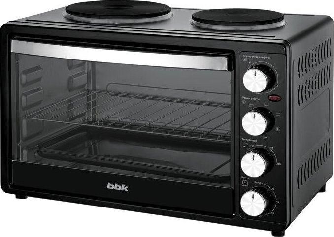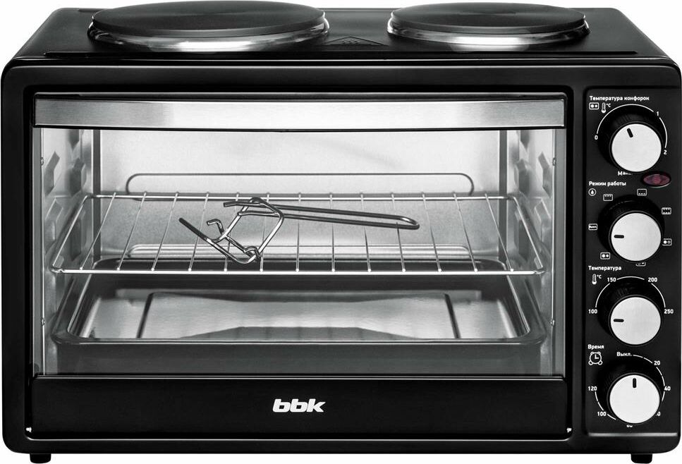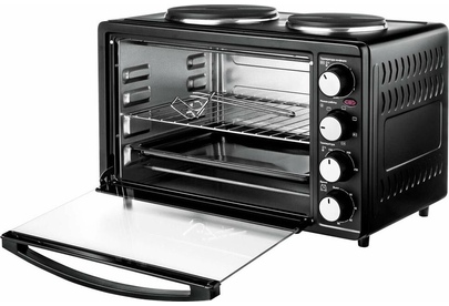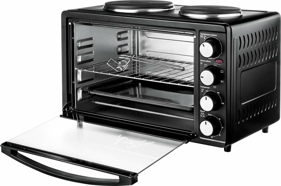 30 л,, механическое упр., 1500 Вт, две конфорки 1000Вт/600Вт, таймер 120 минут со звуковым сигналом, регулировка температуры 100-250 С, функции: гриль, жарка, запекание, Регулировка мощности конфорок, эмалированный противень, решетка и ручка для противня в комплекте