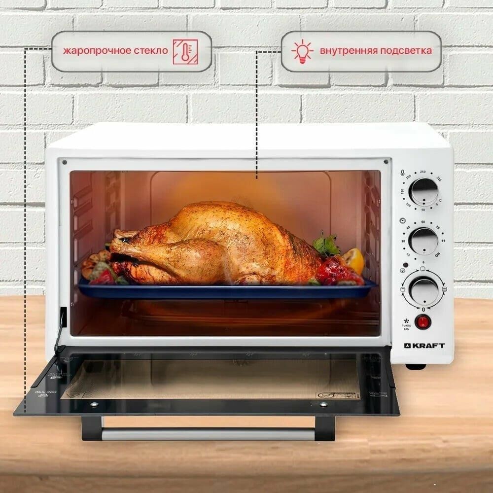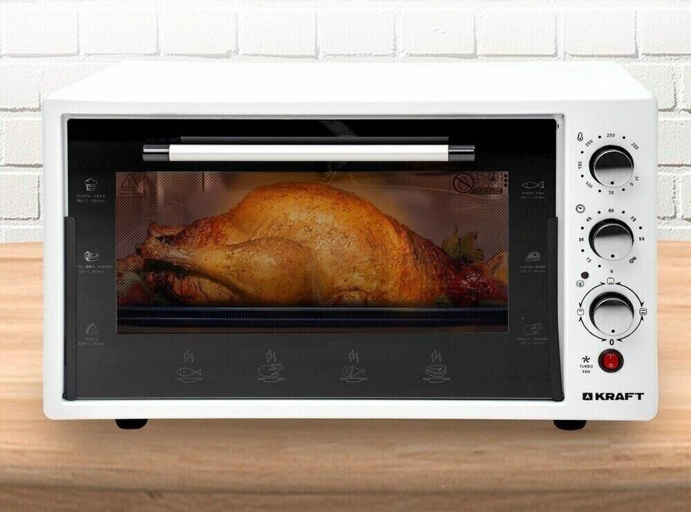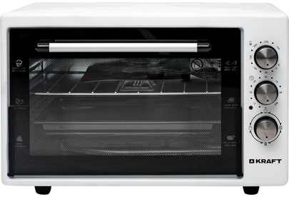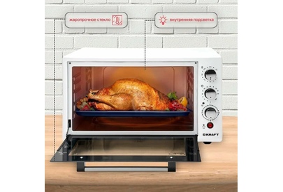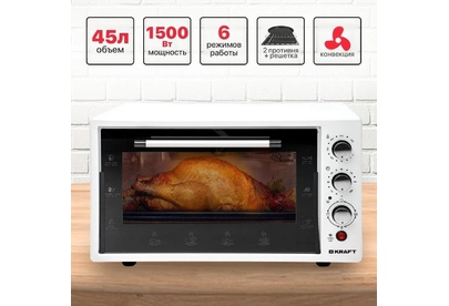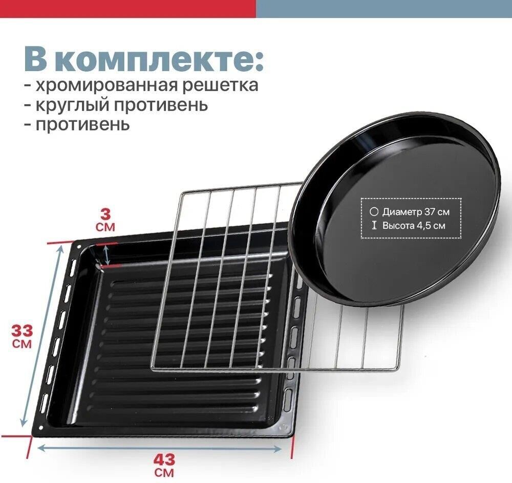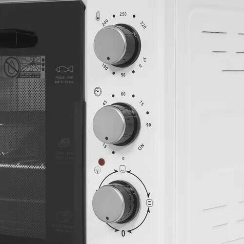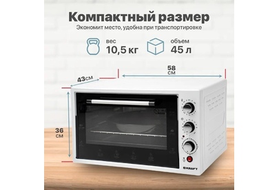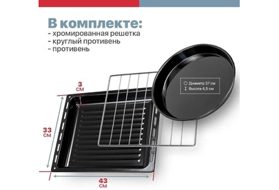 Габариты без упаковки (ШхГхВ) 580x430x330. Вес 10,5 кг. Объем (л) 45. Таймер отключения (мин) 90. Количество режимов работы 3. Максимальная температура (°С) 320. Решетка. Противень для выпечки прямоугольный. Противень Круглый. Термостат. Внутренняя подсветка. Длина шнура (м) 1.2