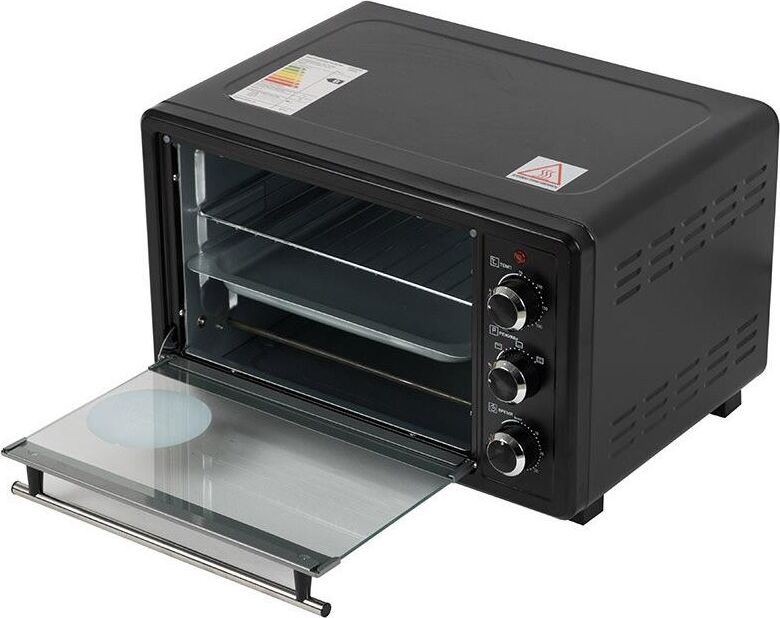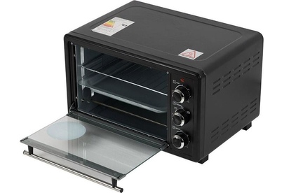 Внутренний объём 25 л, Термостат с диапазоном температур 70-230С, Таймер 60 минут, 3 режима работы (верх, низ, верх+низ), Индикатор работы, Металлическая решетка, противень, Мощность 1400 Вт, Цвет чёрный.