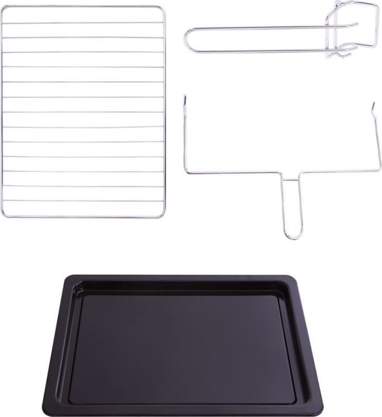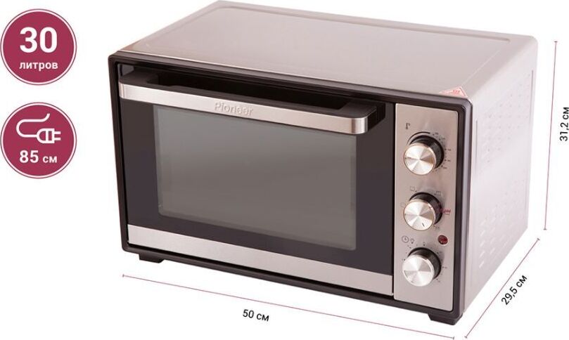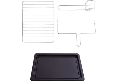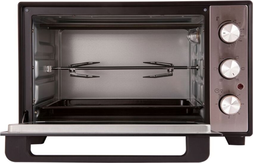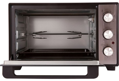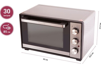 Печь электрическая, объем камеры печи 30 литро, механическое управление, двойное жаропрочное стекло, потребляемая мощность 1600 Вт, температура нагрева печи: 100-250°С, функция электрического гриля, электромеханический вертел, 6 режимов нагрева, таймер до 60 минут, индикация включения, сигнал окончания приготовления, внутренняя подсветка, металлическая решетка, плоский противень, вертел, держатель для вертела, ухват