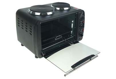 Мощность 3200Вт. Духовка 1500Вт. 2 конфорки (блин). Диаметр конфорок 18,7 и 15,4см. Терморегулятор от 100 до 250 градусов. Таймер на 60мин. Сетевой индикатор. Противень, решетка, ухват. Стальные нагревательные элементы.