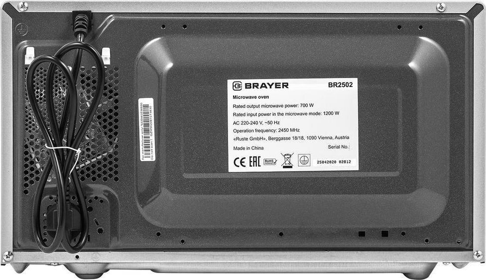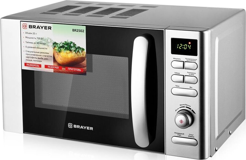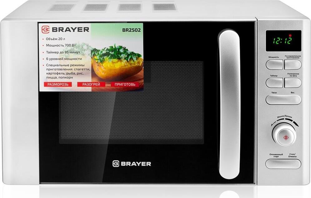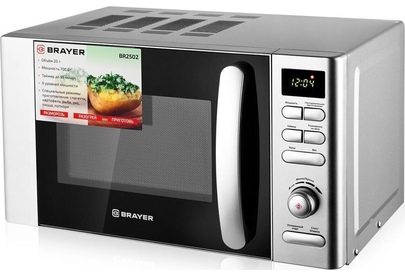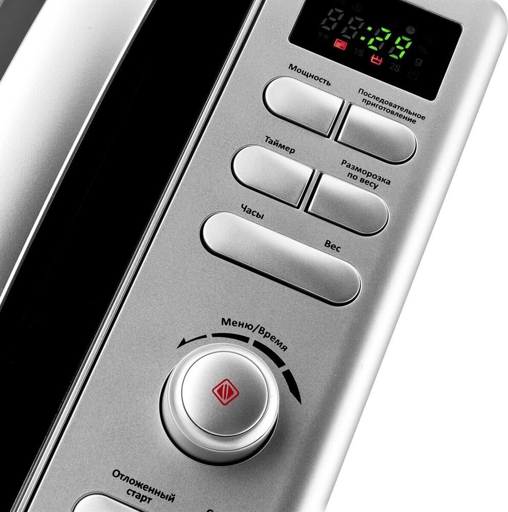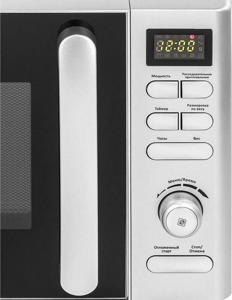 Внутренний объём: 20 л. Цифровое управление. Номинальная микроволновая мощность: 700 Вт. 6 уровней мощности. Блокировка кнопок для безопасности. Разморозка по времени и по весу. Программирование последовательного приготовления. LED-дисплей. Электронные часы. Таймер до 95 минут. Сигнал завершения приготовления. Стеклянное вращающееся блюдо: O 245 мм. Номинальная потребляемая мощность в режиме микроволн: 1200 Вт. Защита от поражения электрическим током: I класс. Рабочая частота: 2450 МГц. Габаритные размеры: 262*452*349 мм. Масса нетто: 10,8 кг. Электропитание: 220-240 В, ~50 Гц.