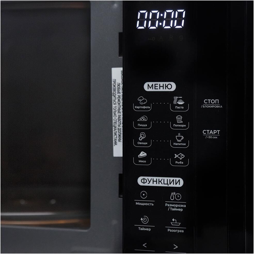 23 Литра, цвет - черный, мощность 800W, 8 автопрограмм, 5 режимов мощности, функция разморозки по весу, быстрый старт, таймер. Сенсорное управление