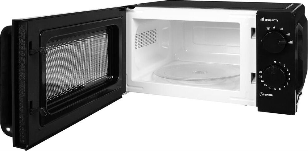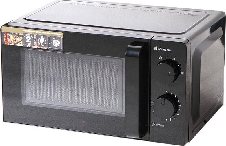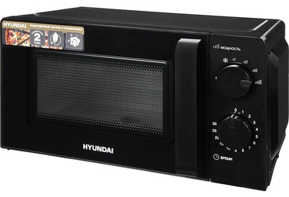 СВЧ Hyundai HYM-M2039 предназначена для подогрева пищи и размораживания продуктов. Для управления используются две поворотные ручки механического типа. Верхняя отвечает за установку мощности, нижняя — за время. С помощью простых манипуляций задается нужный режим. При завершении заданного цикла прозвучит звуковой сигнал. Он достаточно приятный, не вызывает отрицательных эмоций. Корпус изделия выполнен из металла и окрашен полностью в черный цвет. Печь выглядит очень стильно. Дверца открывается при помощи ручки. Внутреннее пространство покрыто специальной эмалью, образующей абсолютно гладкую поверхность. С нее легко убирать загрязнения. Поворотный стол изготовлен из стекла, его можно вынимать и мыть. Благодаря компактным размерам прибор не занимает много места при размещении. Устанавливается на устойчивую ровную поверхность. Прорезиненные ножки исключают скольжение.