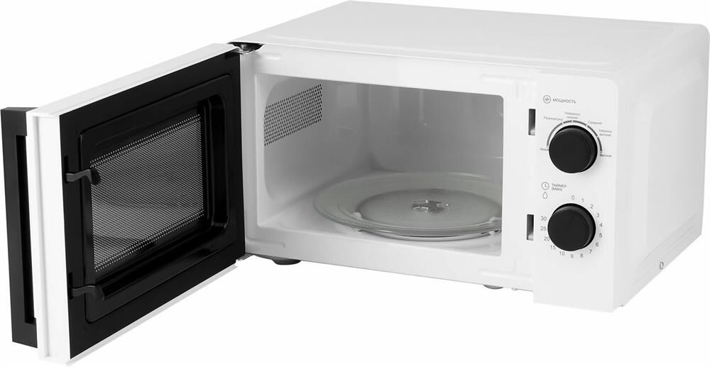 Объем 20 л; Мощность 700 Вт; 6 уровней мощности; Максимальное время приготовления 30 мин; Поворотный стол 24,5 см; Функция разморозки; Сигнал об окончании готовки; Механизм открывания дверцы – ручка; Тип управления: механический; Цвет: белый
