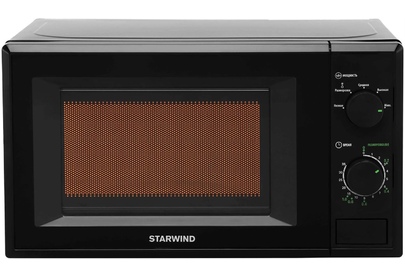 Микроволновая печь Starwind SWM5820 привлекает к себе внимание современным дизайном, корпус черного цвета подойдет для любого стиля интерьера. Оборудование имеет довольно простую конструкцию и компактные размеры. Использовать его можно как дома, так и в офисе. Бытовая техника поможет во время обеденного перерыва быстро подогреть еду. В домашних условиях микроволновую печь удобно использовать для размораживания продуктов, полноценного приготовления различных блюд. Мощность устройства составляет 700 Ватт. Внутренняя часть имеет объем в 20 литров, покрытие у нее из эмали, которая легко и быстро чистится. Управлять бытовым прибором необходимо с помощью поворотных рукояток, позволяющих установить нужно время нагрева и температуру.