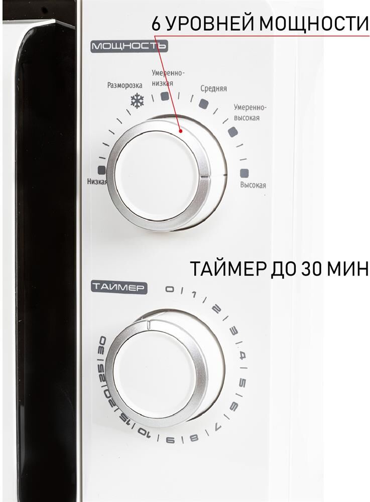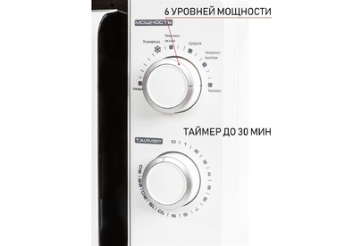 Печь микроволновая, объем 20л, выходная мощность 700 Вт, тип управления механический, 6 уровней мощности, разморозка, таймер на 30 минут, диаметр поворотного стола 245 мм, сигнал окончания приготовления.