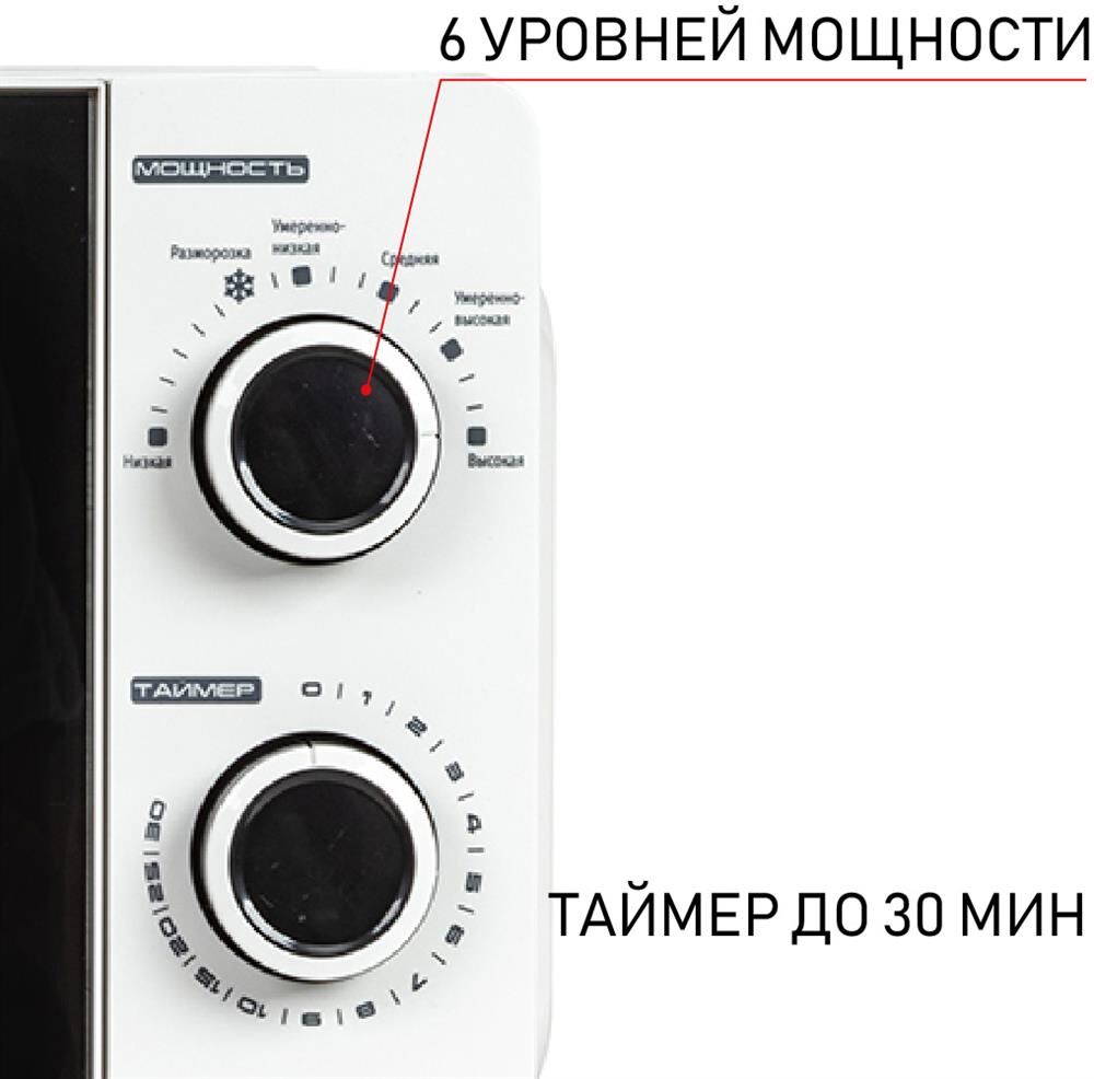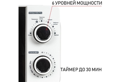 Печь микроволновая, объем 20л, выходная мощность 700 Вт, тип управления механический, 6 уровней мощности, разморозка, таймер на 30 минут, диаметр поворотного стола 245 мм, сигнал окончания приготовления.