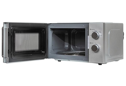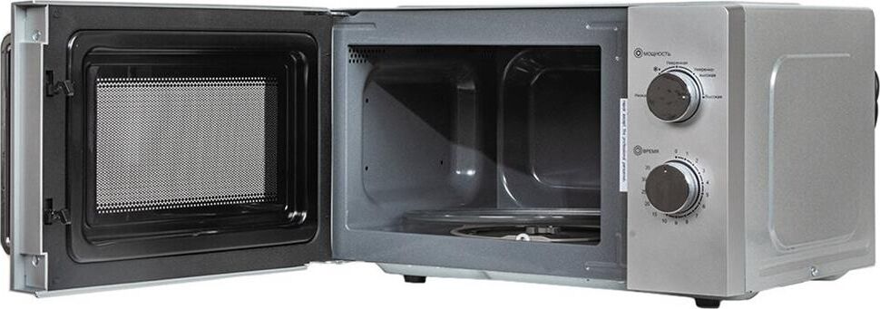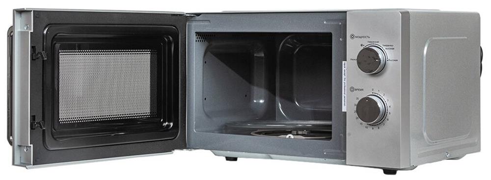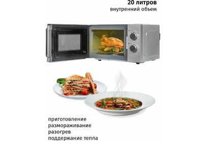 Печь микроволновая, объем 20л, выходная мощность 700 Вт, тип управления: механический, диаметр поворотного стола: 255 мм, количество уровней мощности: 5, автоматическое размораживание, таймер: 35 минут, тип открывания дверцы: ручка, сигнал окончания приготовления, цвет: серебро