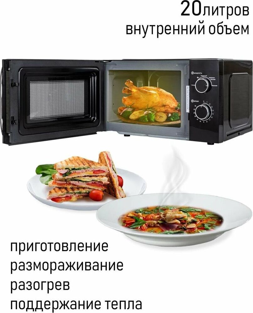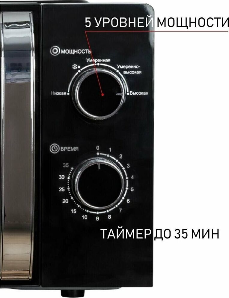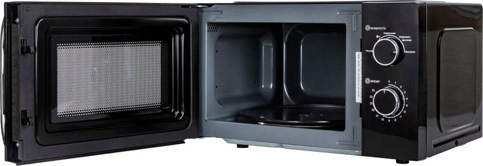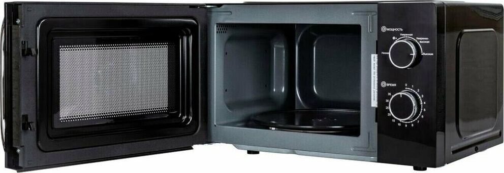 Печь микроволновая, объем 20л, выходная мощность 700 Вт, тип управления: механический, диаметр поворотного стола: 255 мм, количество уровней мощности: 5, автоматическое размораживание, таймер: 35 минут, тип открывания дверцы: ручка, сигнал окончания приготовления, цвет: черный