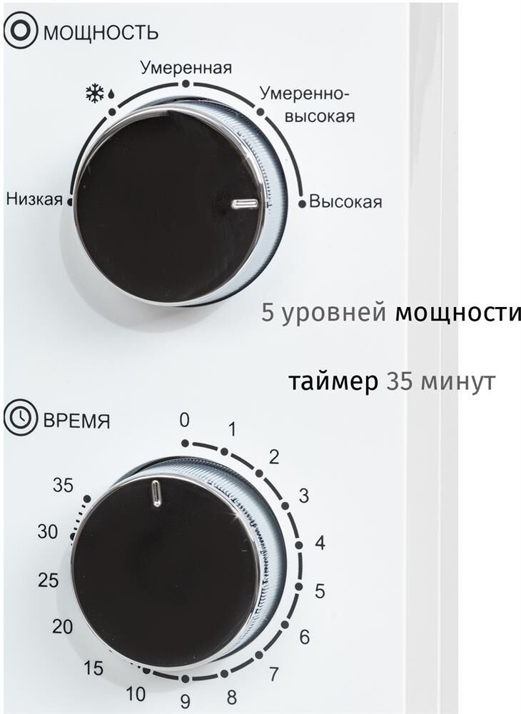 Печь микроволновая, объем 20л, выходная мощность 700 Вт, тип управления: механический, диаметр поворотного стола: 255 мм, количество уровней мощности: 5, автоматическое размораживание, таймер: 35 минут, тип открывания дверцы: ручка, сигнал окончания приготовления, цвет: белый