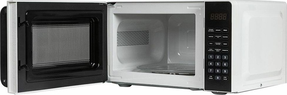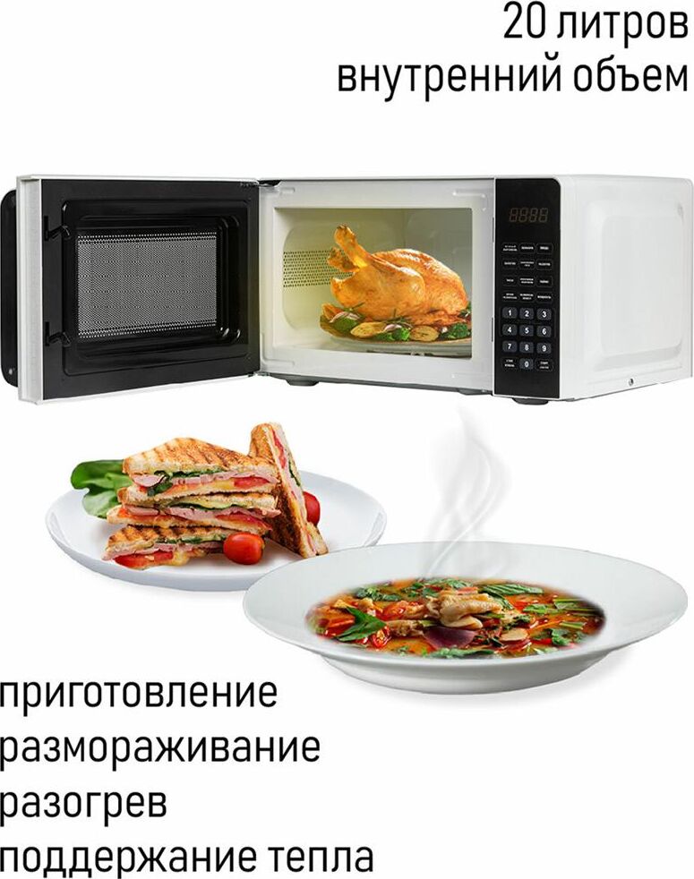 Печь микроволновая, объем 20л, выходная мощность 700 Вт, тип управления: сенсорная, 10 уровней мощности, 6 программ автоприготовления, разморозка по весу и времени, таймер на 99 минут, блокировка от детей, диаметр поворотного стола 245 мм, сигнал окончания приготовления.