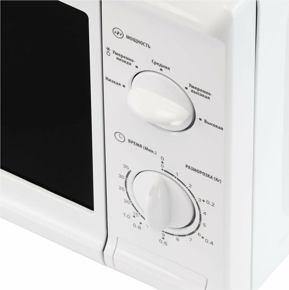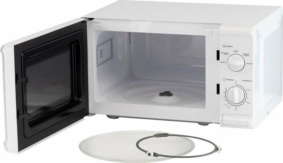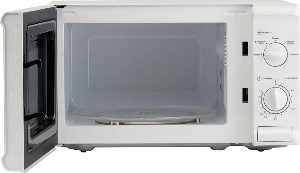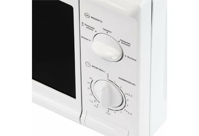 Объем 20 л; Мощность 700 Вт; 5 уровней мощности; Максимальное время приготовления 35 мин; Поворотный стол 25,5 см; Функция разморозки; Сигнал об окончании готовки; Механизм открывания дверцы – кнопка; Тип управления: механический; Цвет: белый
