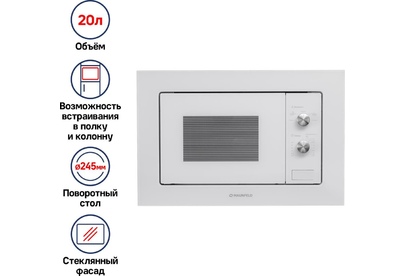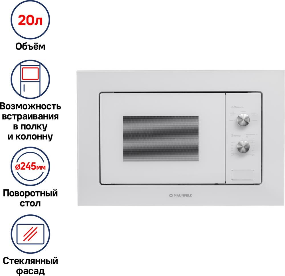 Печь микроволновая встраиваемая MAUNFELD Встраиваемая микроволновая печь MBMO.20.1PGW, 20л, 800Вт, белый [ка-00013588]